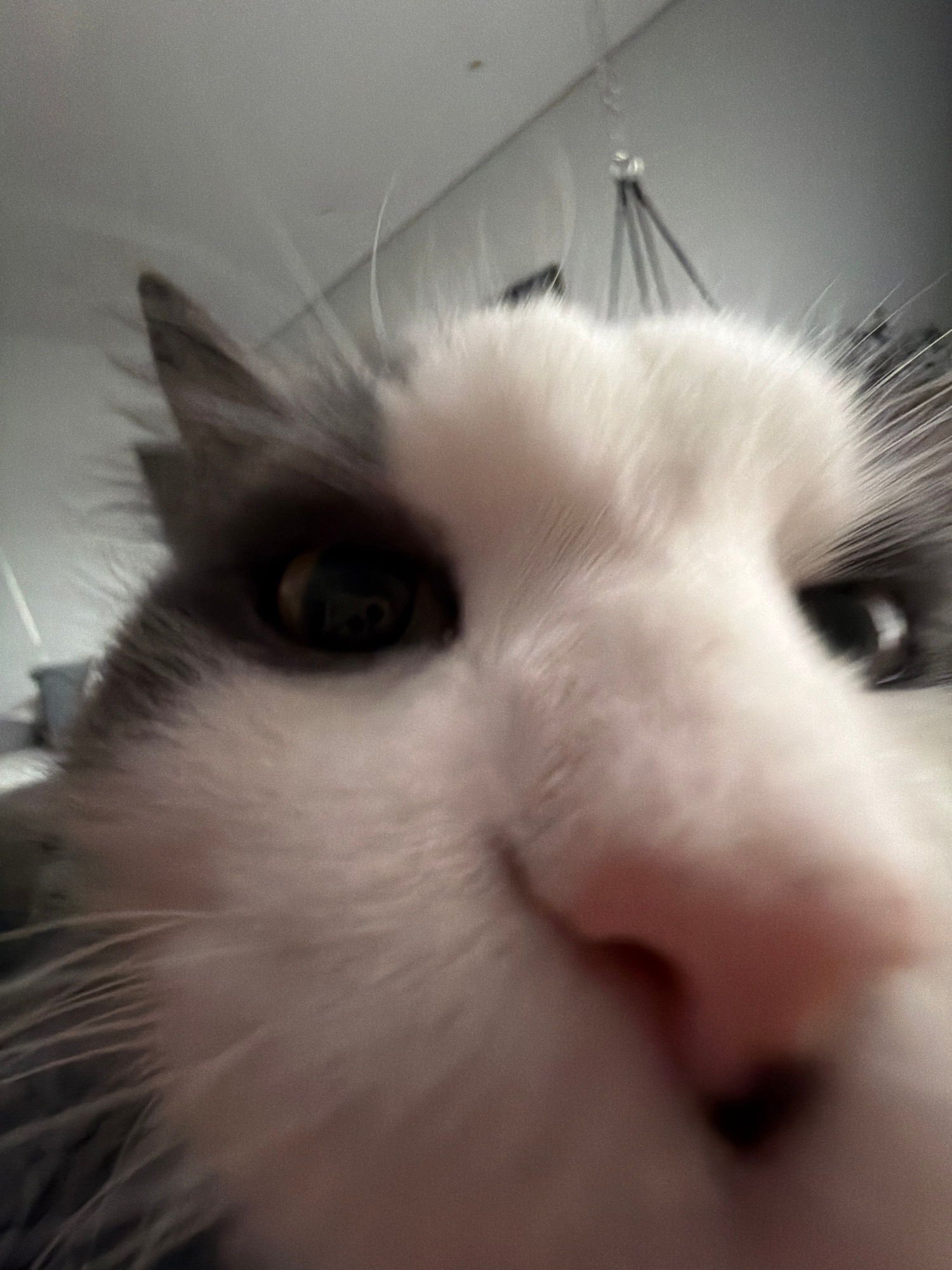 A close-up photograph shows the face of a cat, dominated by its pink nose and white fur. One eye is visible, and there are whiskers. The background is out of focus, appearing to be a white or gray sur…read more