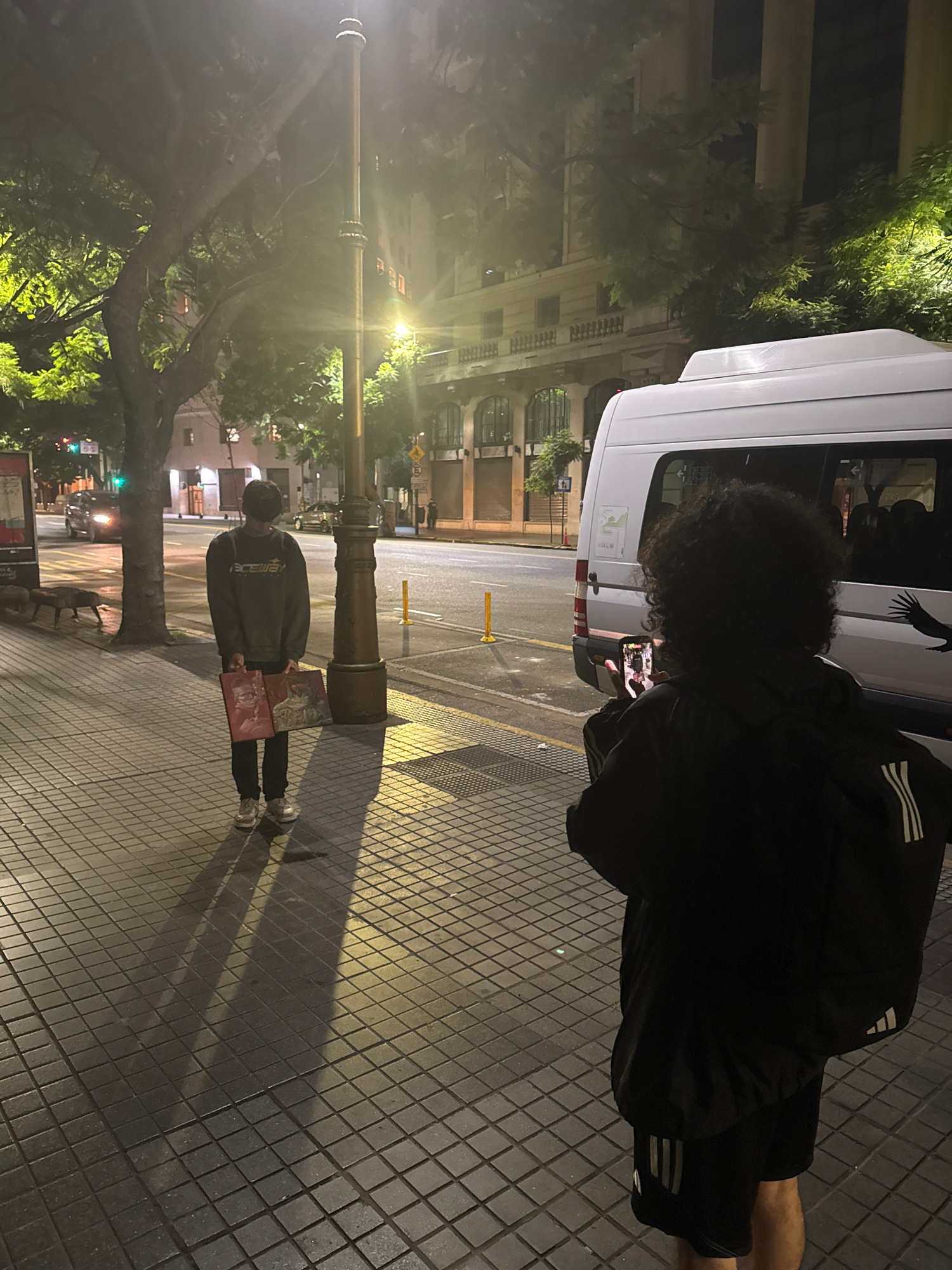 A nighttime street scene in Buenos Aires, Argentina shows a person with dark, curly hair standing on a tiled sidewalk near a white van, looking at a cell phone. A second individual, also on the sidew…read more