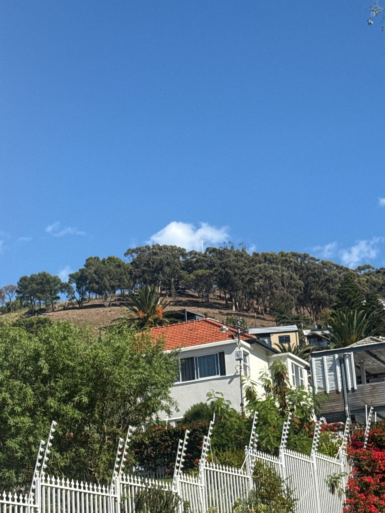 The image depicts a residential scene, potentially located on a hillside. A mix of vegetation, including trees and shrubs, fills the lower portion of the image. A series of houses are visible, some wi…read more