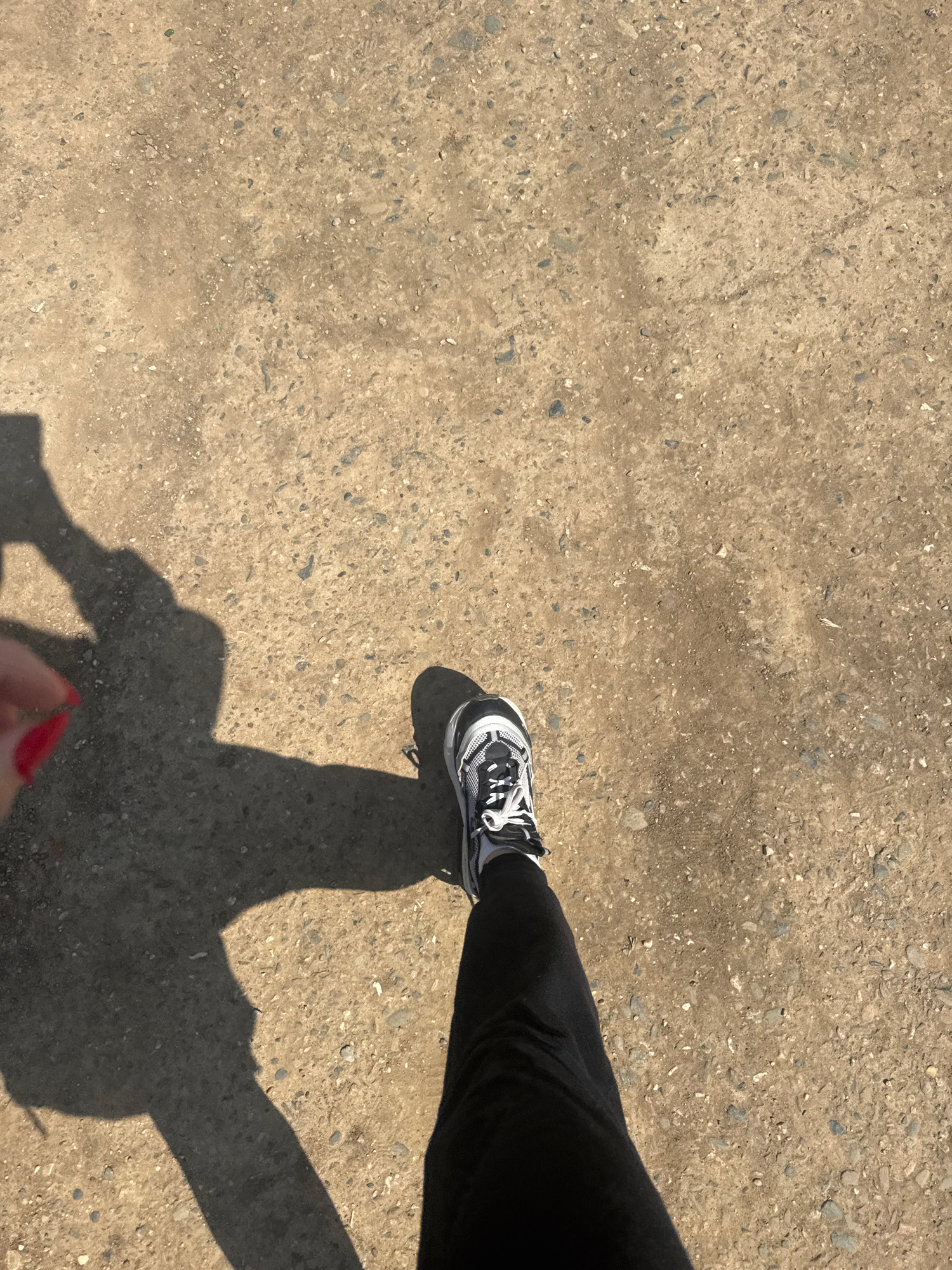 The image captures a top-down view of a person's lower leg and foot, set against a sunlit, earthy ground surface. The person wears black pants or leggings and a black and white athletic shoe with whit…read more