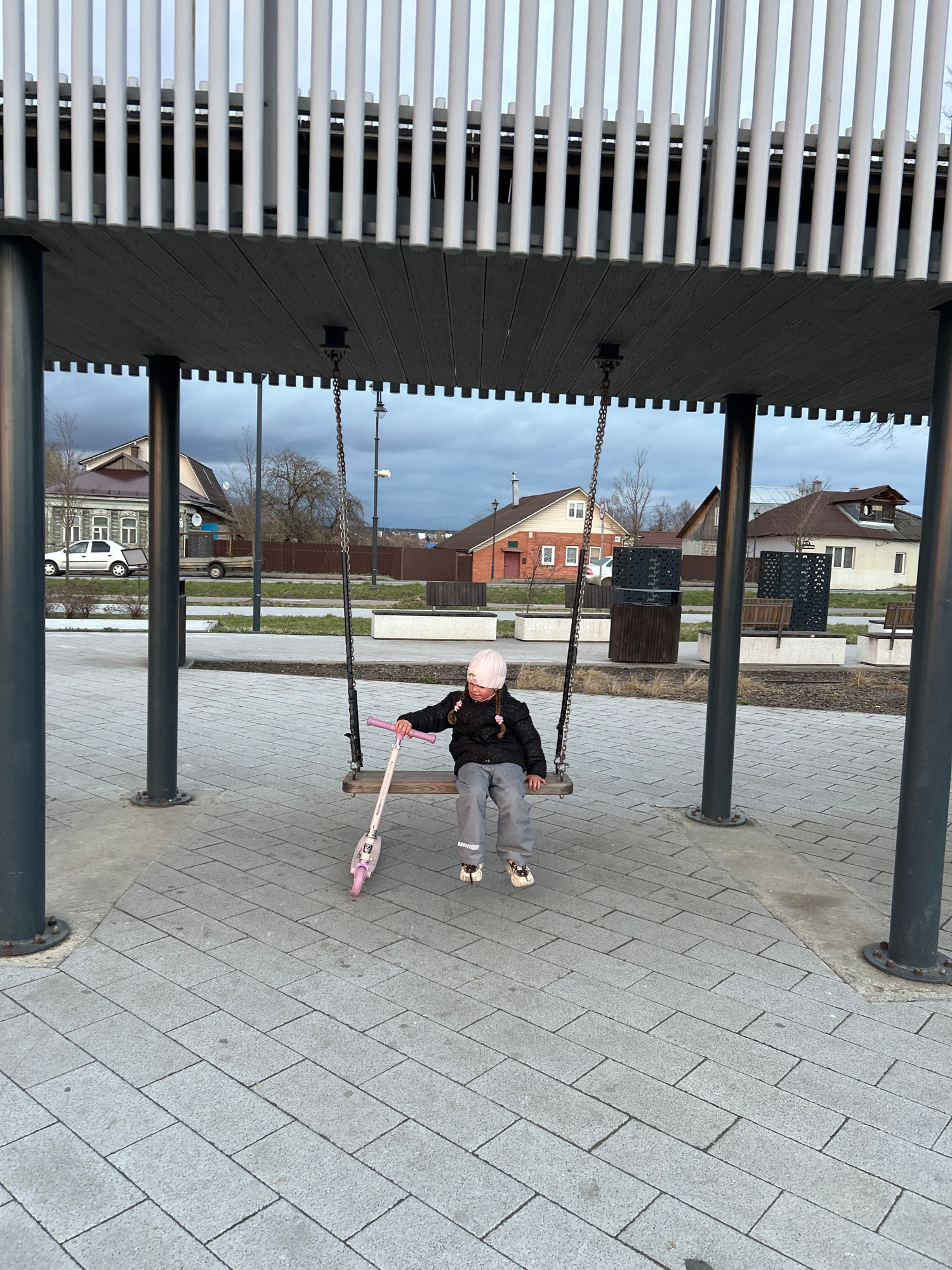 A child in a black jacket, gray pants, and a pink hat is on a swing in a park in Klin, Russia. The child holds a pink scooter. The park has gray pavers and black metal poles. Buildings and trees are v…read more