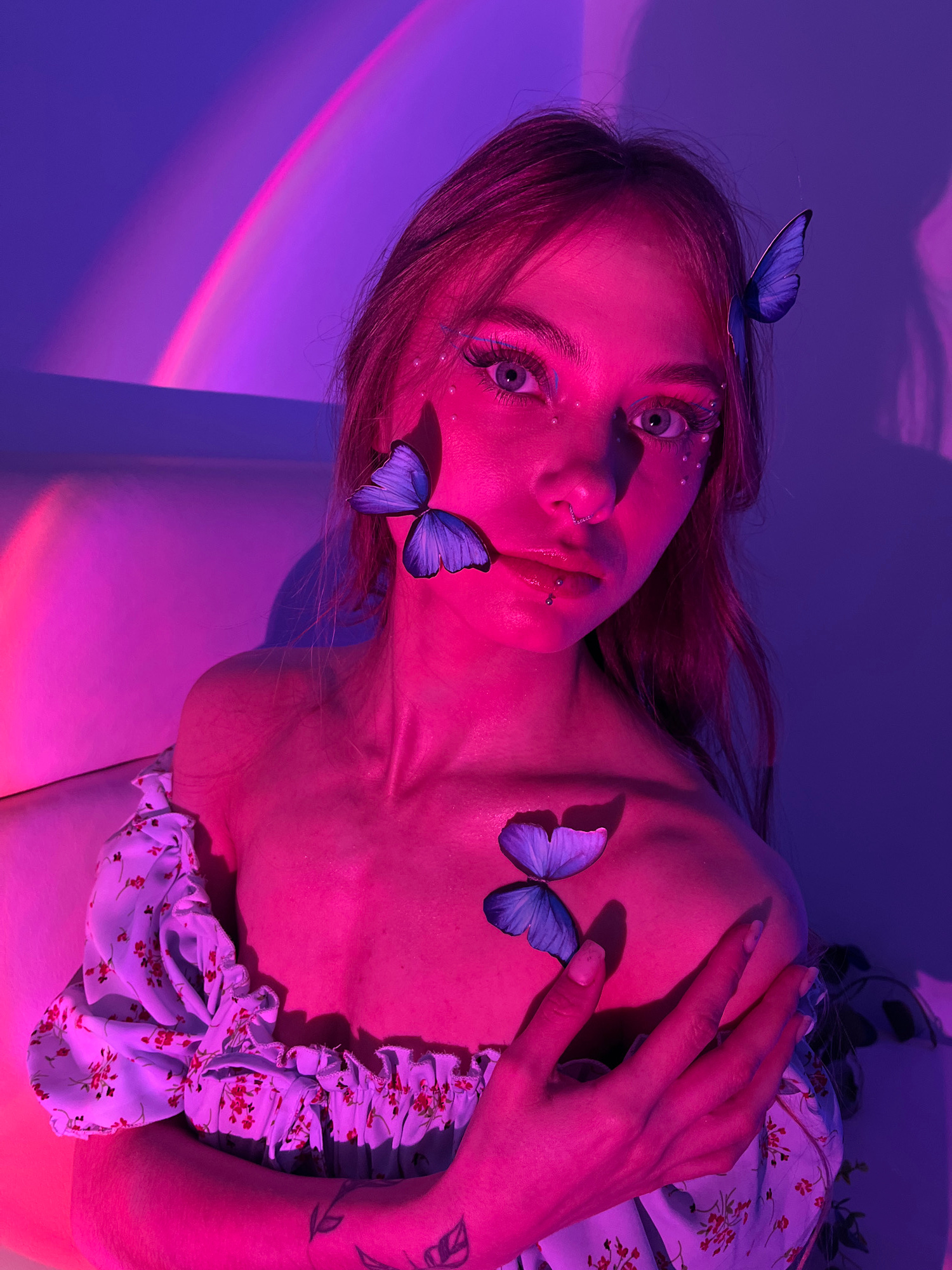 A woman is lying down, oriented at an angle, illuminated by pink and purple light, with three artificial blue butterflies adhered to her face and chest and another to the hair above her forehead. She…read more