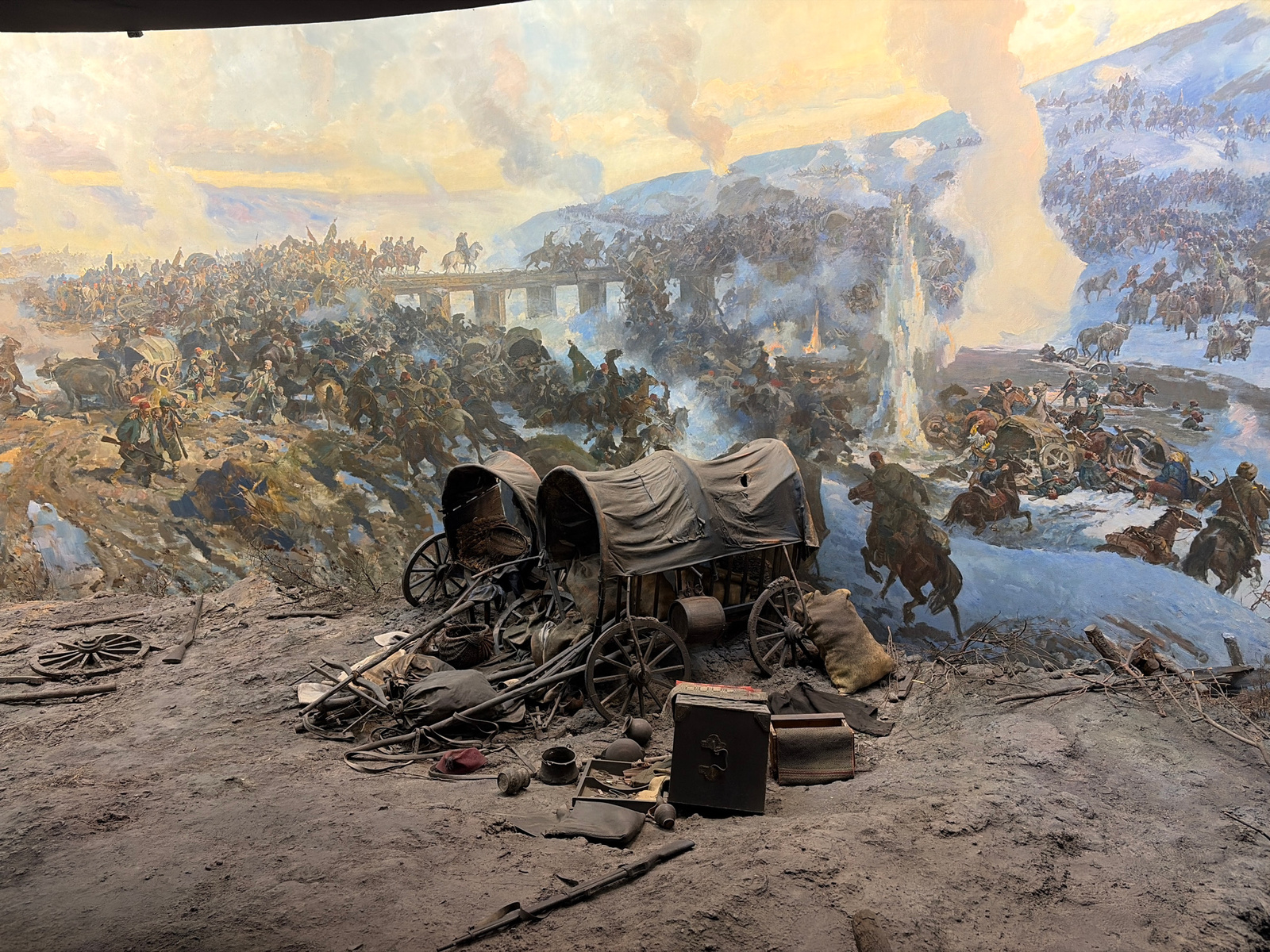 This image depicts a panorama of the siege of Pleven, Bulgaria. The foreground is a muddy terrain with discarded military equipment and damaged wagons. Debris such as broken wagon wheels, sacks, trunk…read more