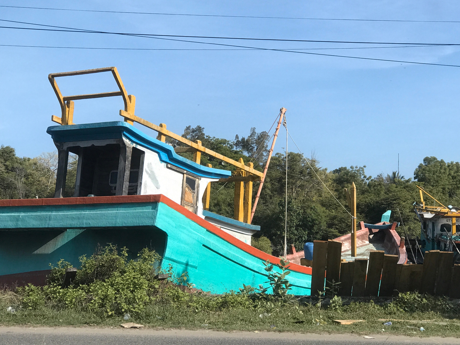 The image shows an abandoned or decommissioned colorful fishing boat in what appears to be a yard or storage area. The boat is painted in turquoise, white, red, and blue with yellow structural compone…read more