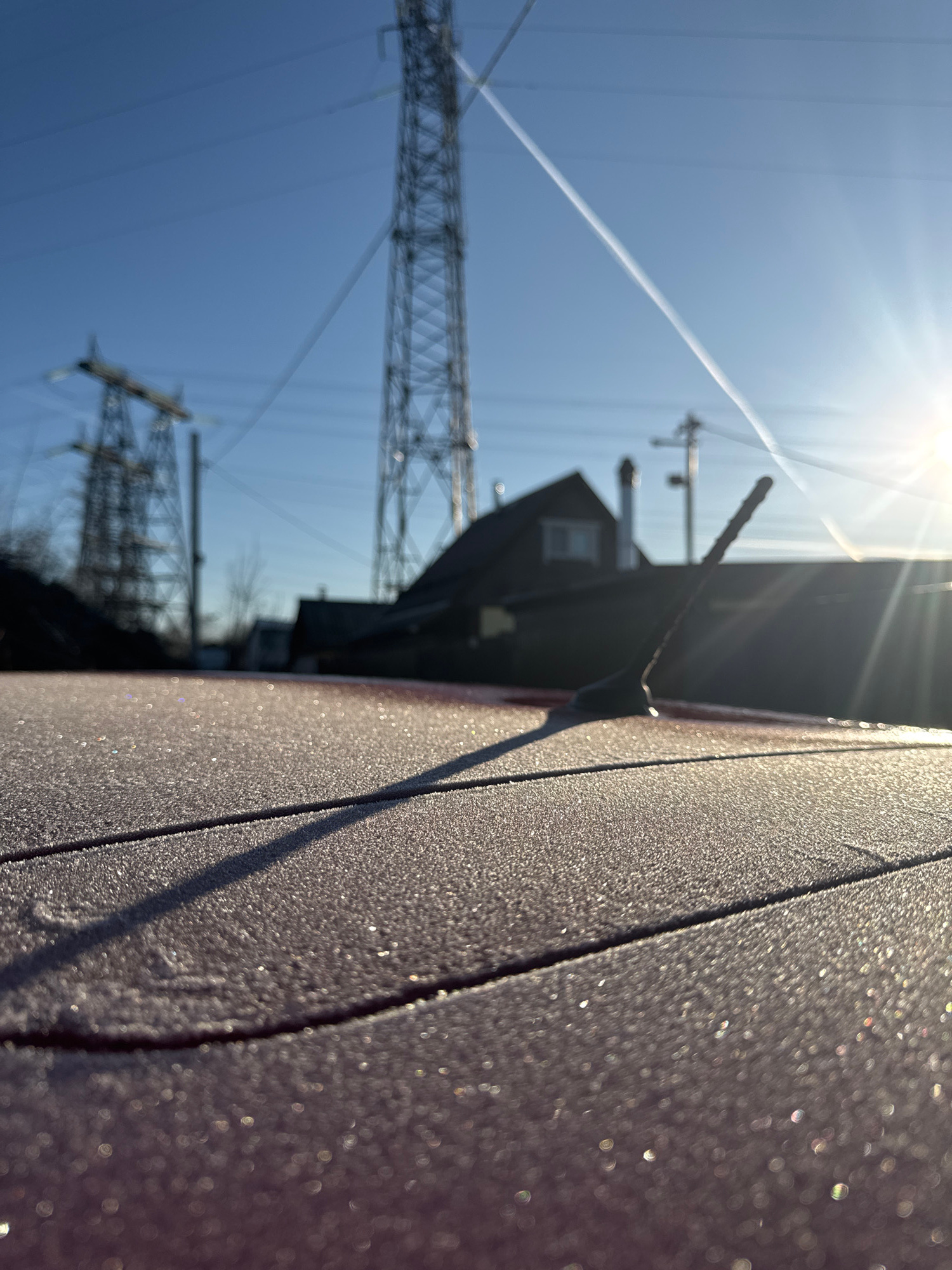 A low-angle, rotated view captures a frosty surface in the foreground, possibly a car's exterior. The frost is illuminated by the sun, creating a shimmering effect. In the background, a power transmis…read more