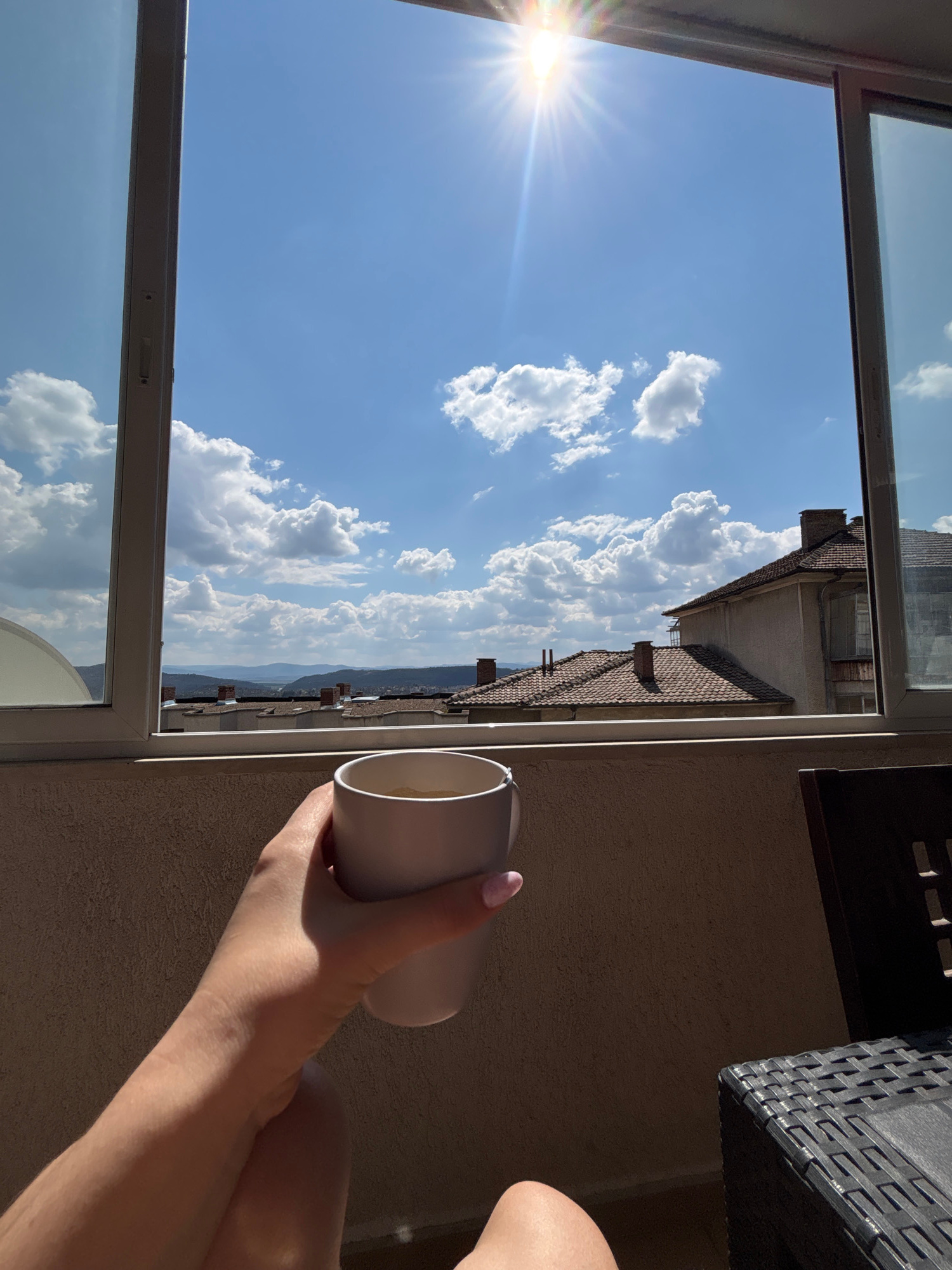 A person is holding a light gray mug with a beige interior, near a window. The window shows a view of Veliko Tarnovo, Bulgaria. The bright sunlight illuminates the left portion of the sky, highlightin…read more