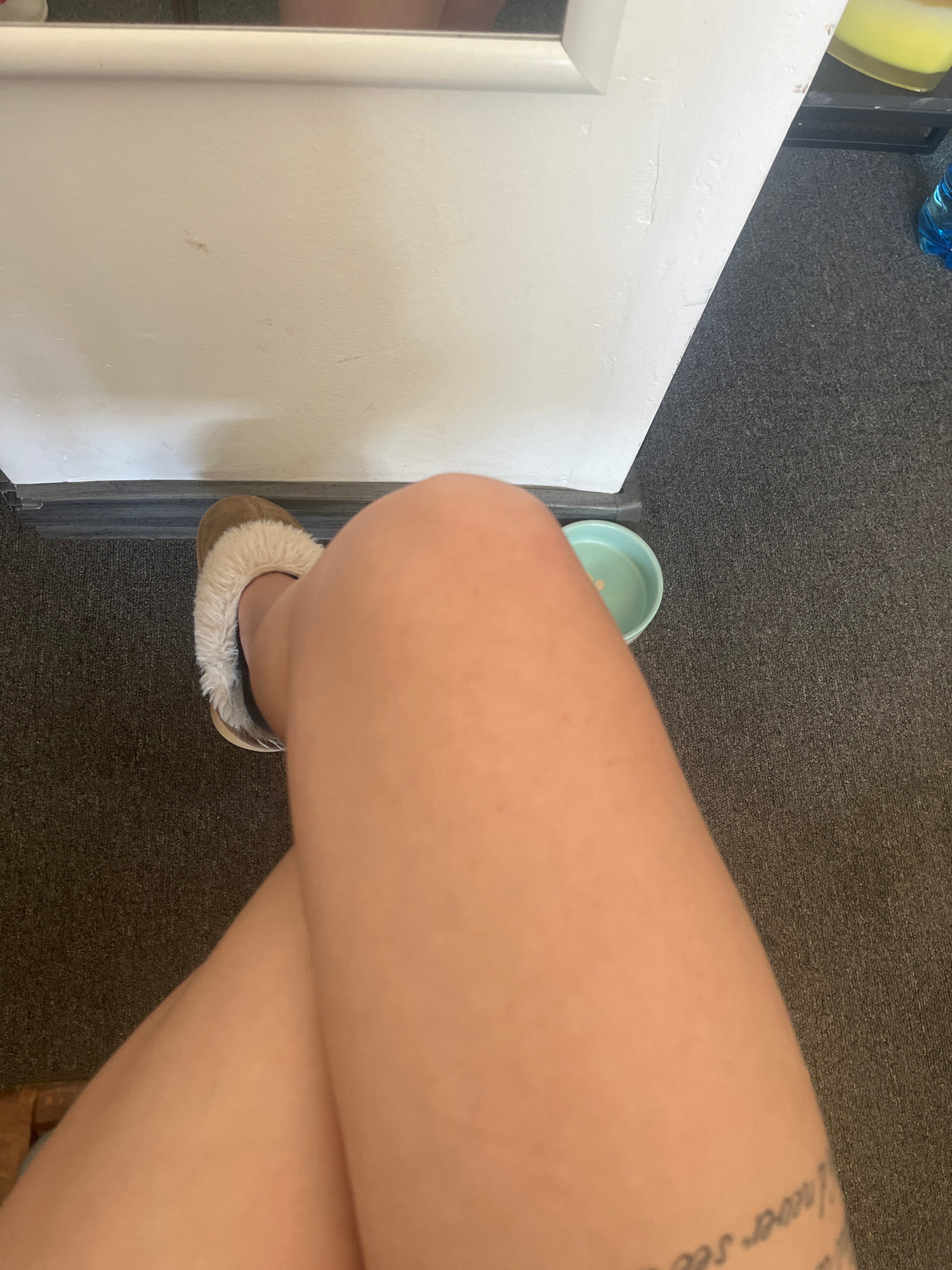 A top-down shot shows a section of a white door and a person's crossed legs and slipper-clad foot. A small green bowl sits near the door on a dark gray carpet. The person's upper leg has visible textβ¦read more