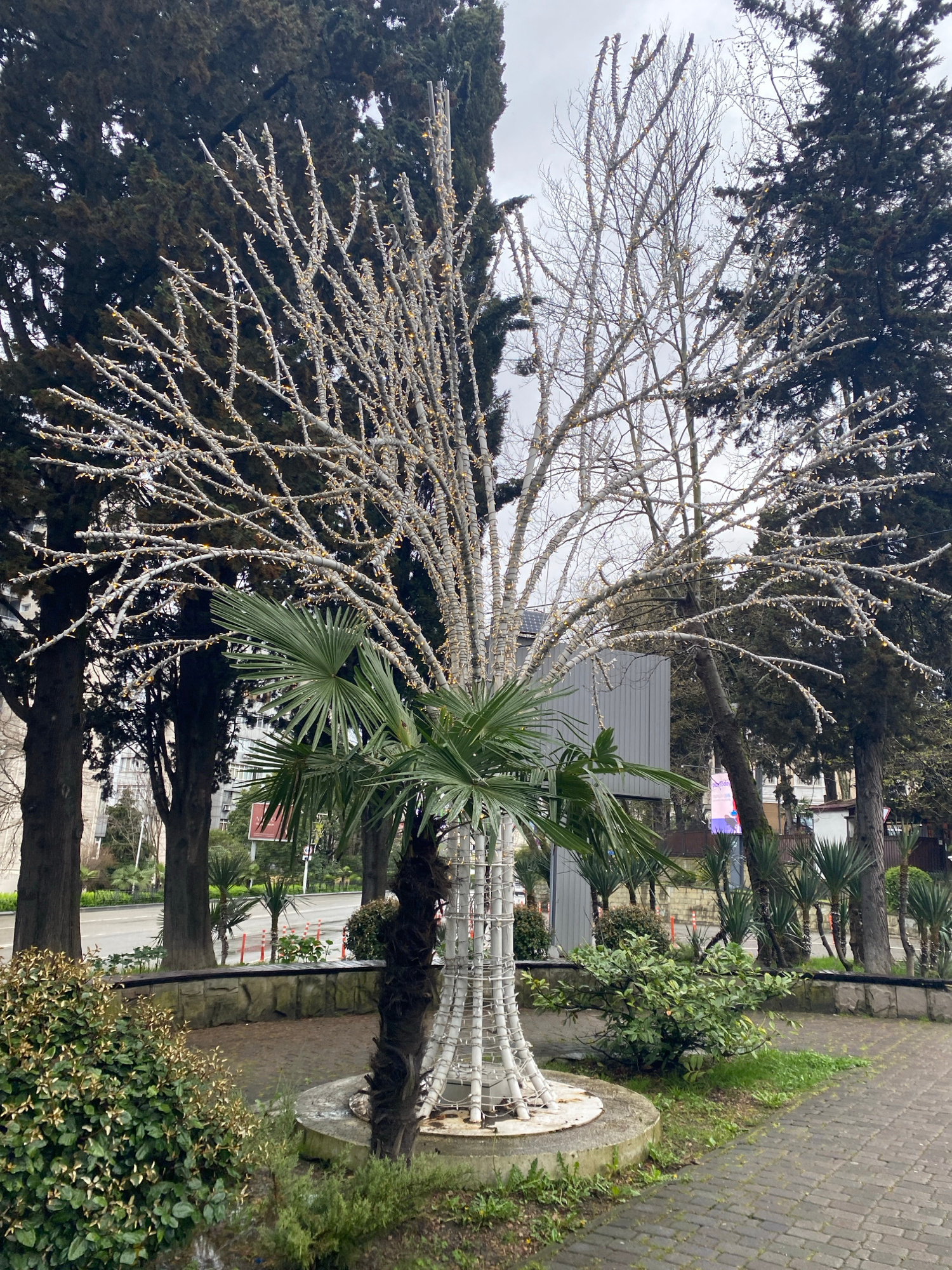 The image shows an artificial tree decorated with Christmas lights, standing next to a palm tree in a park. The sky is overcast. The location is likely in Sochi, Russia, given the style of the street…read more