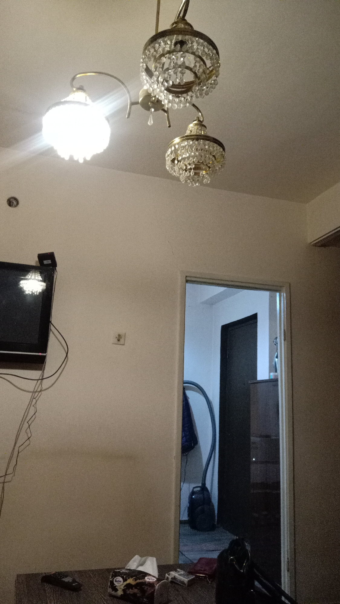 The image is an interior shot of a room with white walls and a white ceiling. A three-light chandelier hangs from the ceiling. A television is mounted on the left wall, with electrical wires hanging d…read more