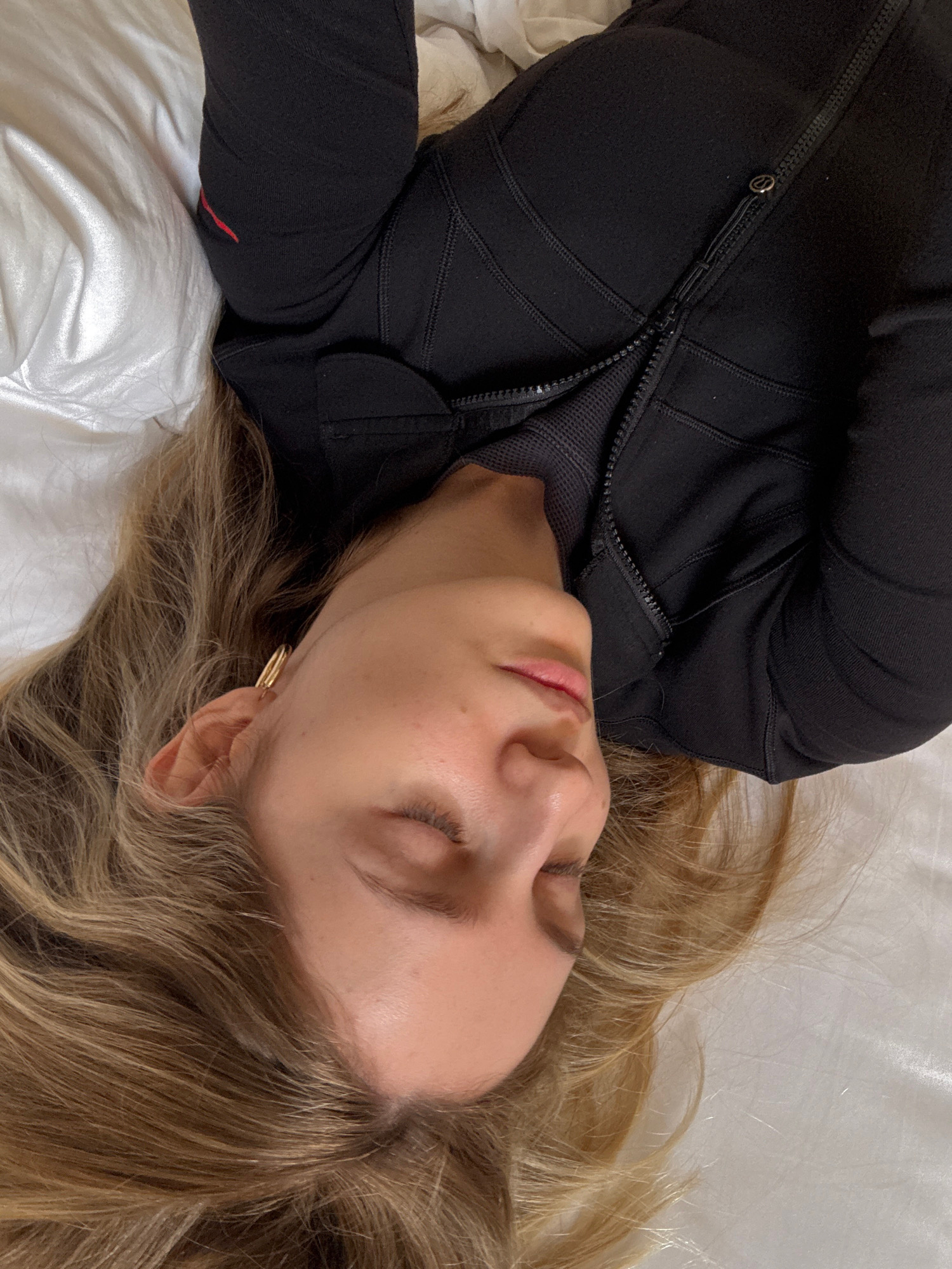 A single individual with light skin, closed eyes, and long blonde hair is depicted lying on their back on a white bed with a white pillow. The person wears a black, long-sleeved athletic top with a fu…read more