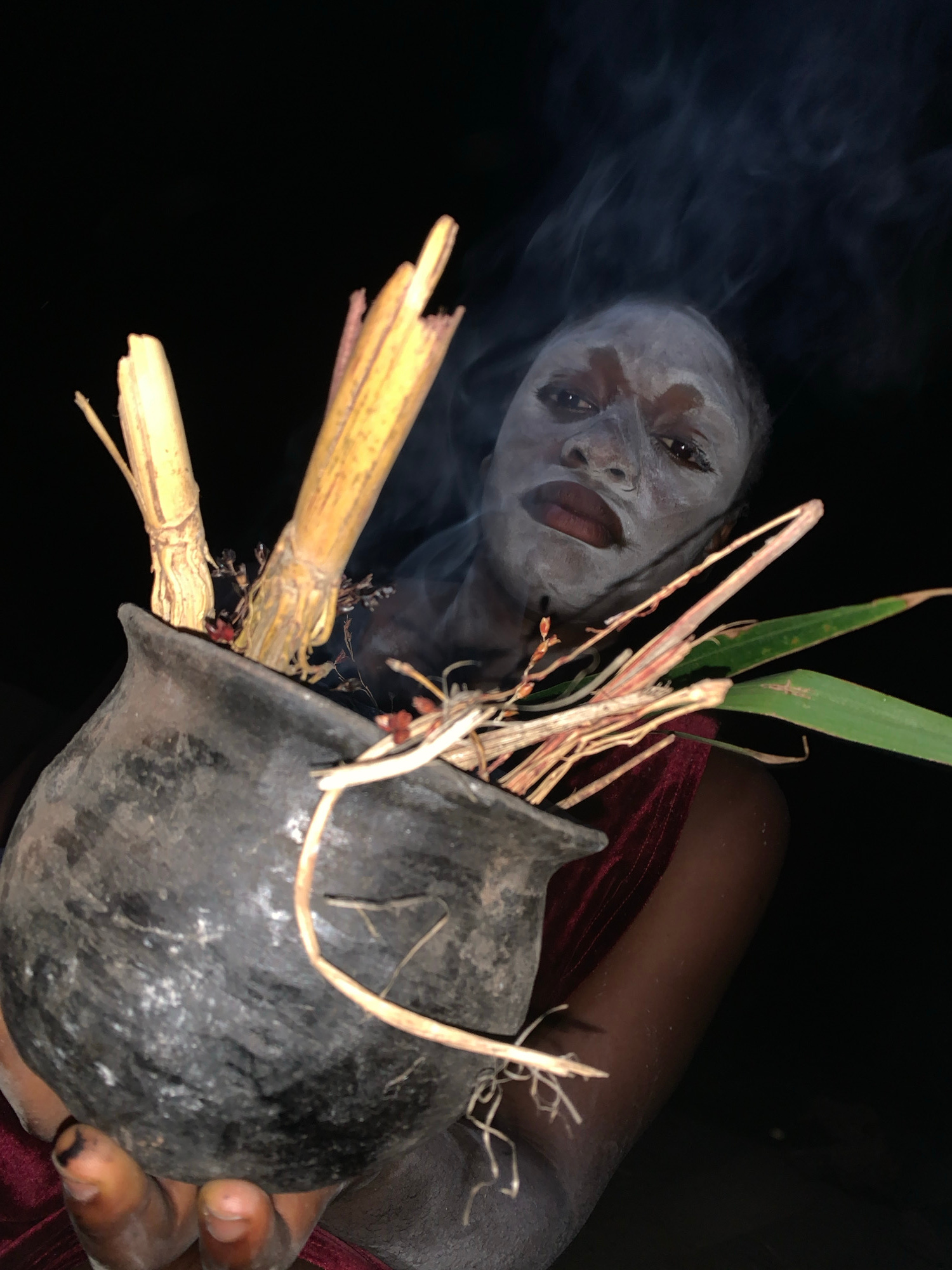 The image depicts a person with white facial markings holding a black, earthenware pot filled with plant matter, including reeds, leaves, and roots. Smoke emanates from the pot's contents. The person…read more