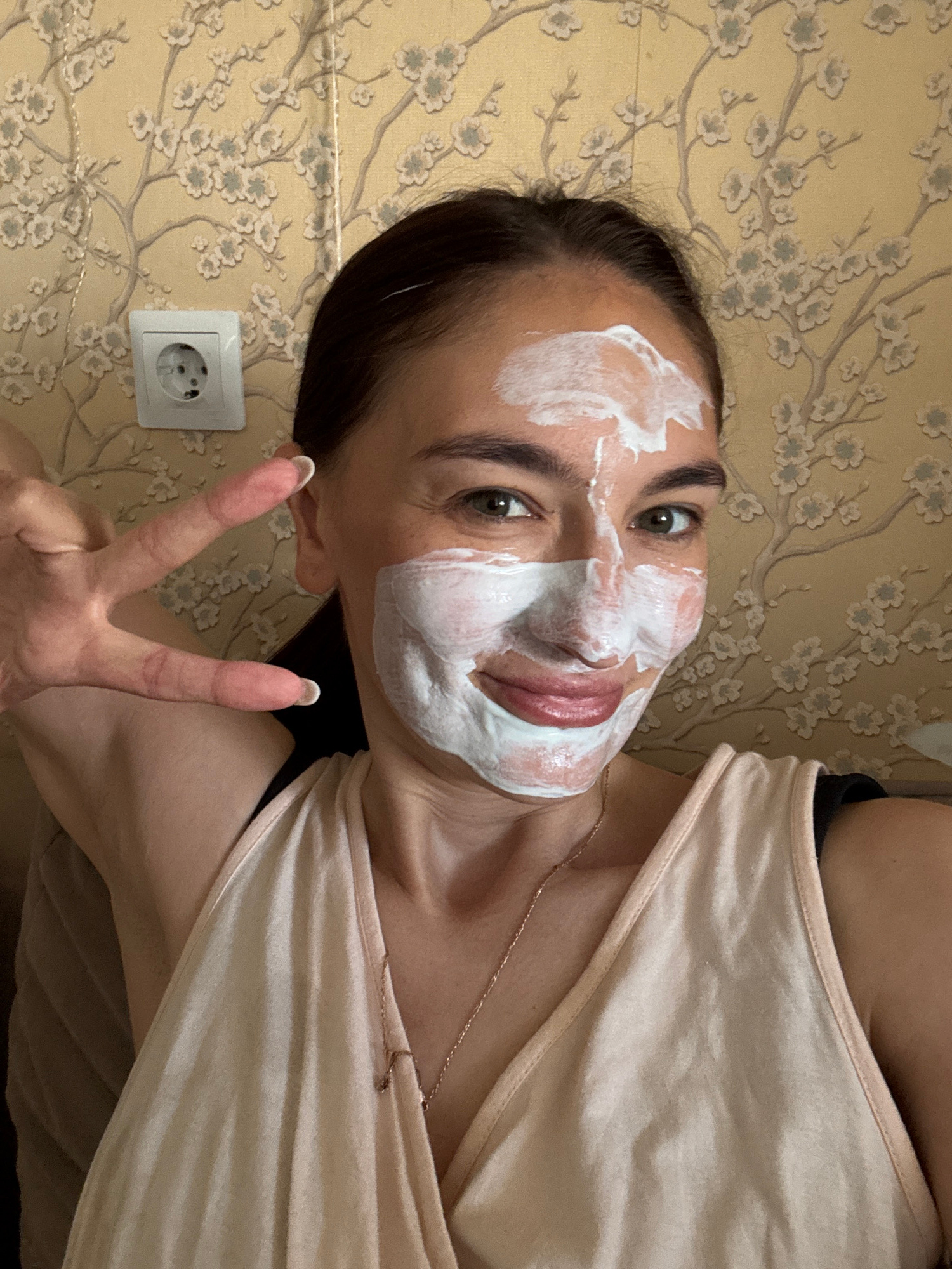 A woman is lying down, angled towards the camera, with a white facial mask applied. She is making a peace sign with her left hand. She is wearing a light pink tank top and a thin gold necklace. The ba…read more
