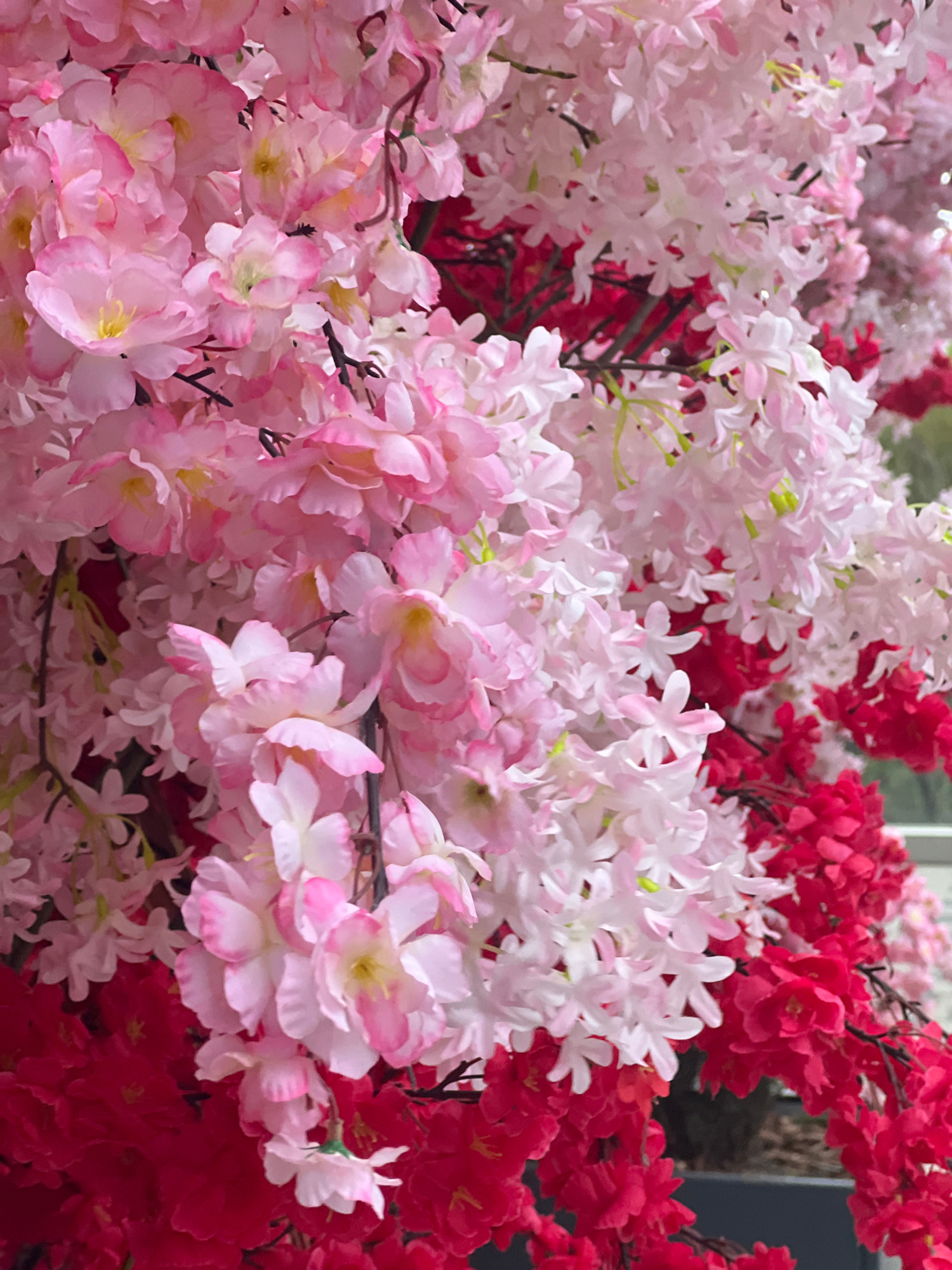 The image depicts a dense arrangement of artificial cherry blossom branches in various shades of pink and red. The blossoms are clustered together, creating a visually full and vibrant display. The li…read more