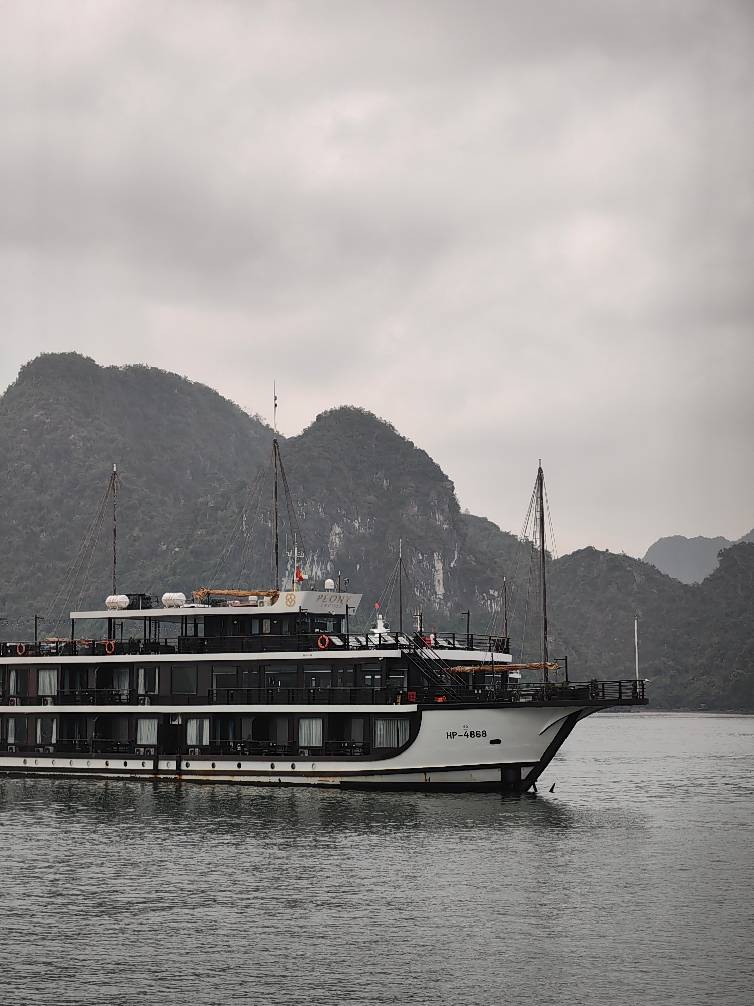 The image depicts a multi-deck cruise ship, possibly named "Peony Cruise" based on a partial view of the name on the ship's deck, sailing on the waters of Ha Long Bay in Hải Phòng, Vietnam. The ship is painted in black and white, with visible decks, windows, and life-saving equipment. The ship's hull displays the registration number "HP-4868." In the background, there are limestone karsts characteristic of the Ha Long Bay landscape, shrouded in mist. The sky is overcast, indicating a cloudy day. The water is calm and gray. The overall impression is a landscape view of Ha Long Bay with a focus on a cruise ship navigating its waters. | Open Wire