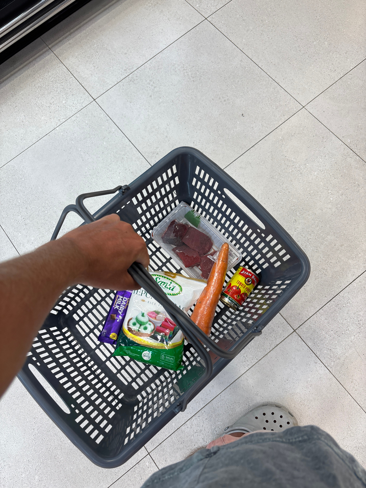 An overhead shot captures a person shopping at what appears to be a grocery store or supermarket in Kuta Selatan, Indonesia. The primary subjects are a person's right hand gripping the handle of a gre…read more