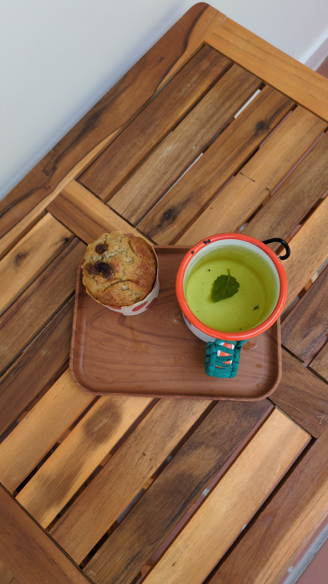 A high-angle shot depicts a cup of tea and a muffin presented on a wooden table with a slatted surface. The tea is contained within a white enamel mug, rimmed with orange and featuring a paracord-wrap…read more