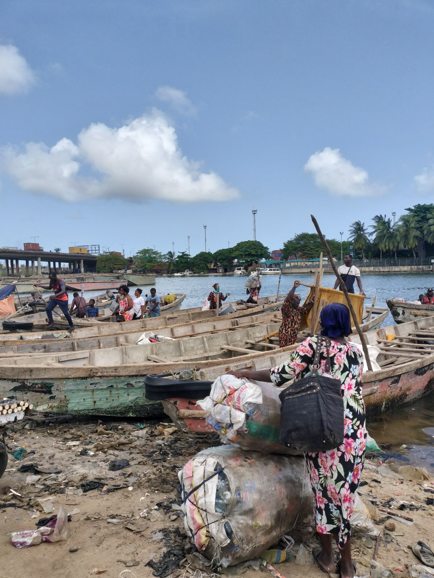 This image depicts a bustling waterfront scene in Lagos, Nigeria, under a bright blue sky with scattered white clouds. Numerous weathered wooden boats are docked along a sandy shore, which is visibly…read more