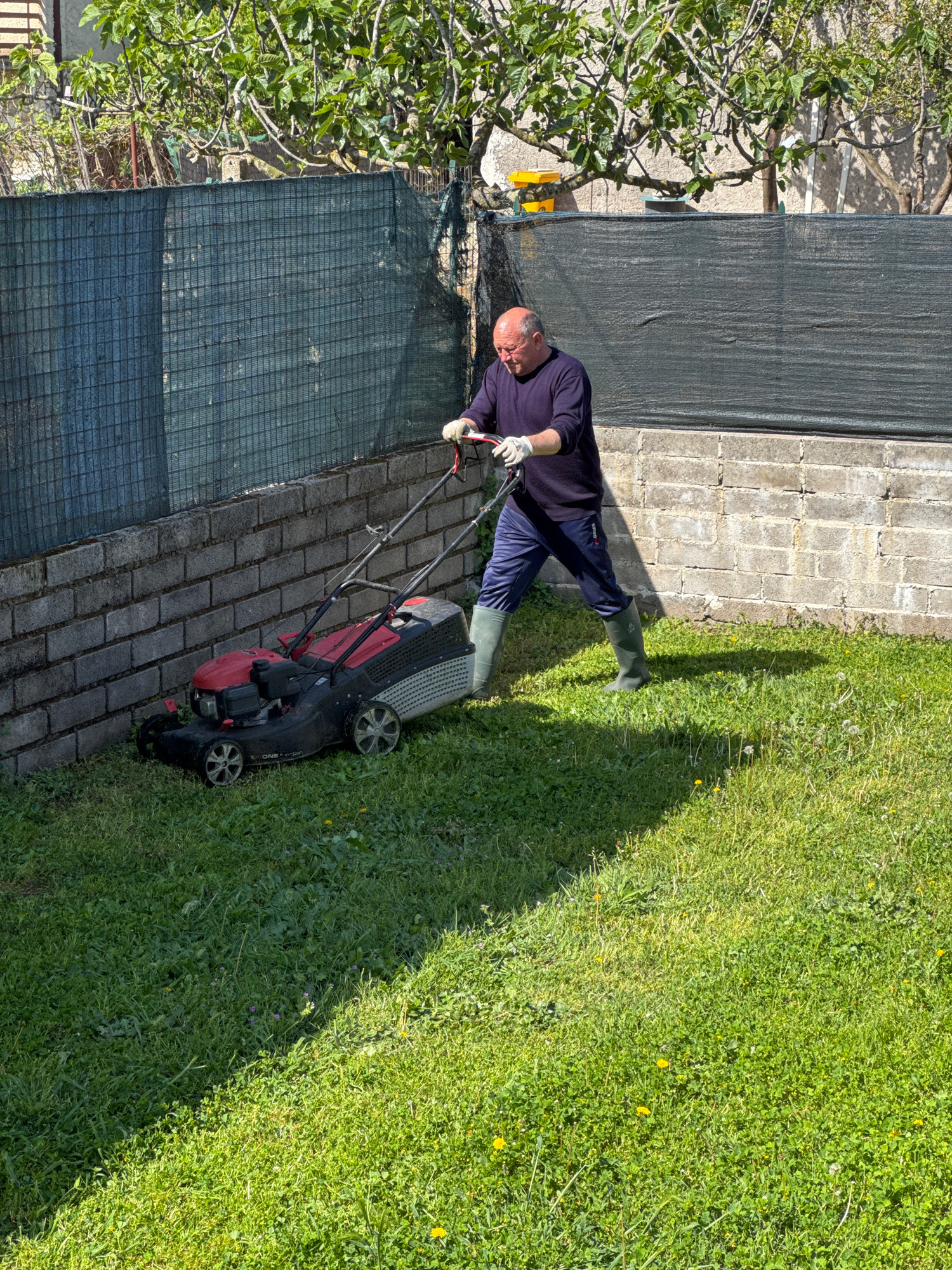 The image, taken from a high angle, shows a man mowing a lawn in a sunny outdoor setting, likely a backyard or garden. The man, with a bald head and wearing a dark blue long-sleeved top, dark blue tro…read more