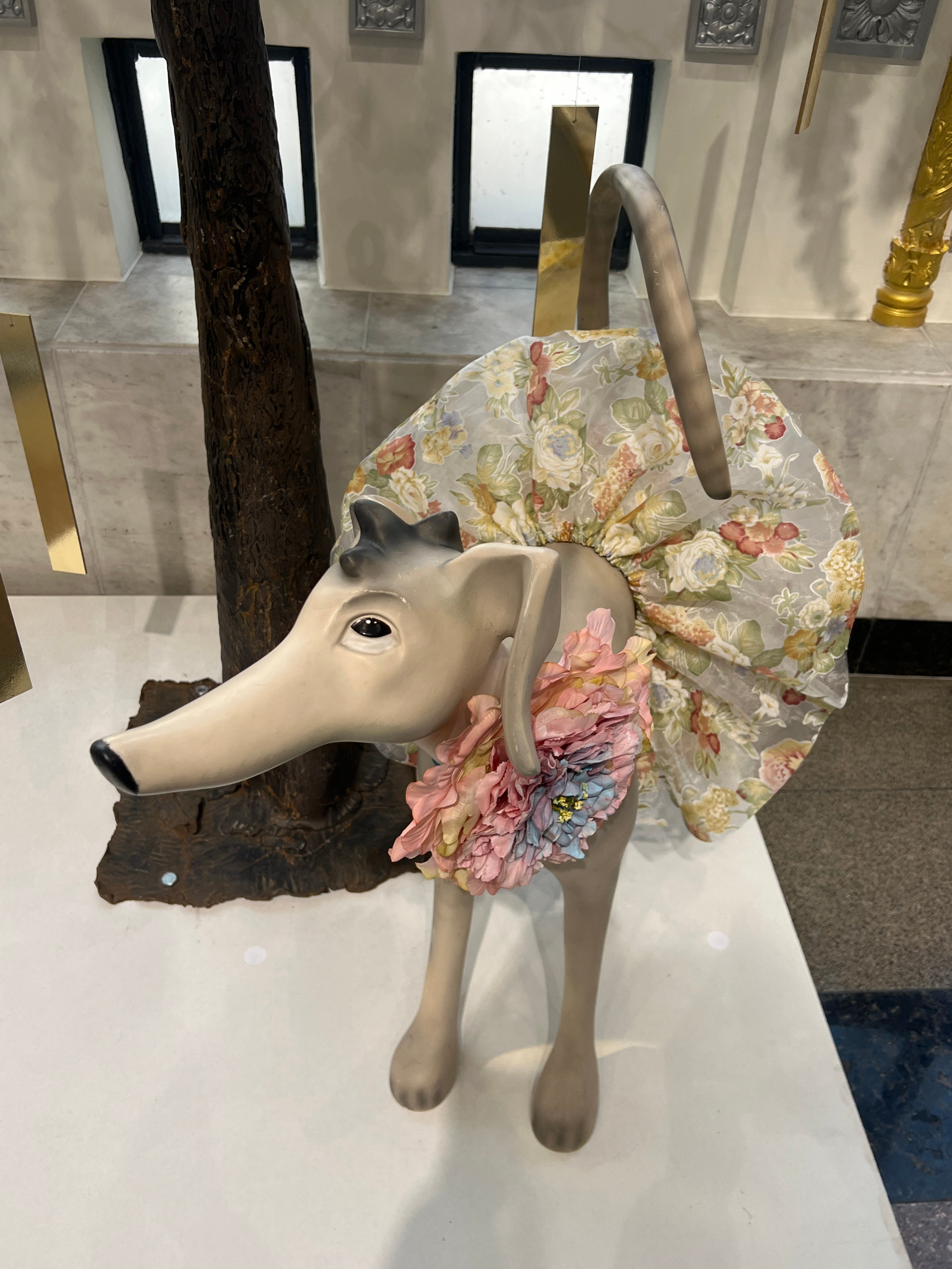 The image depicts a statue of a dog wearing a floral dress and a floral wreath around its neck. The statue is mounted on a piece of dark wood. The setting appears to be indoors, next to a staircase wi…read more