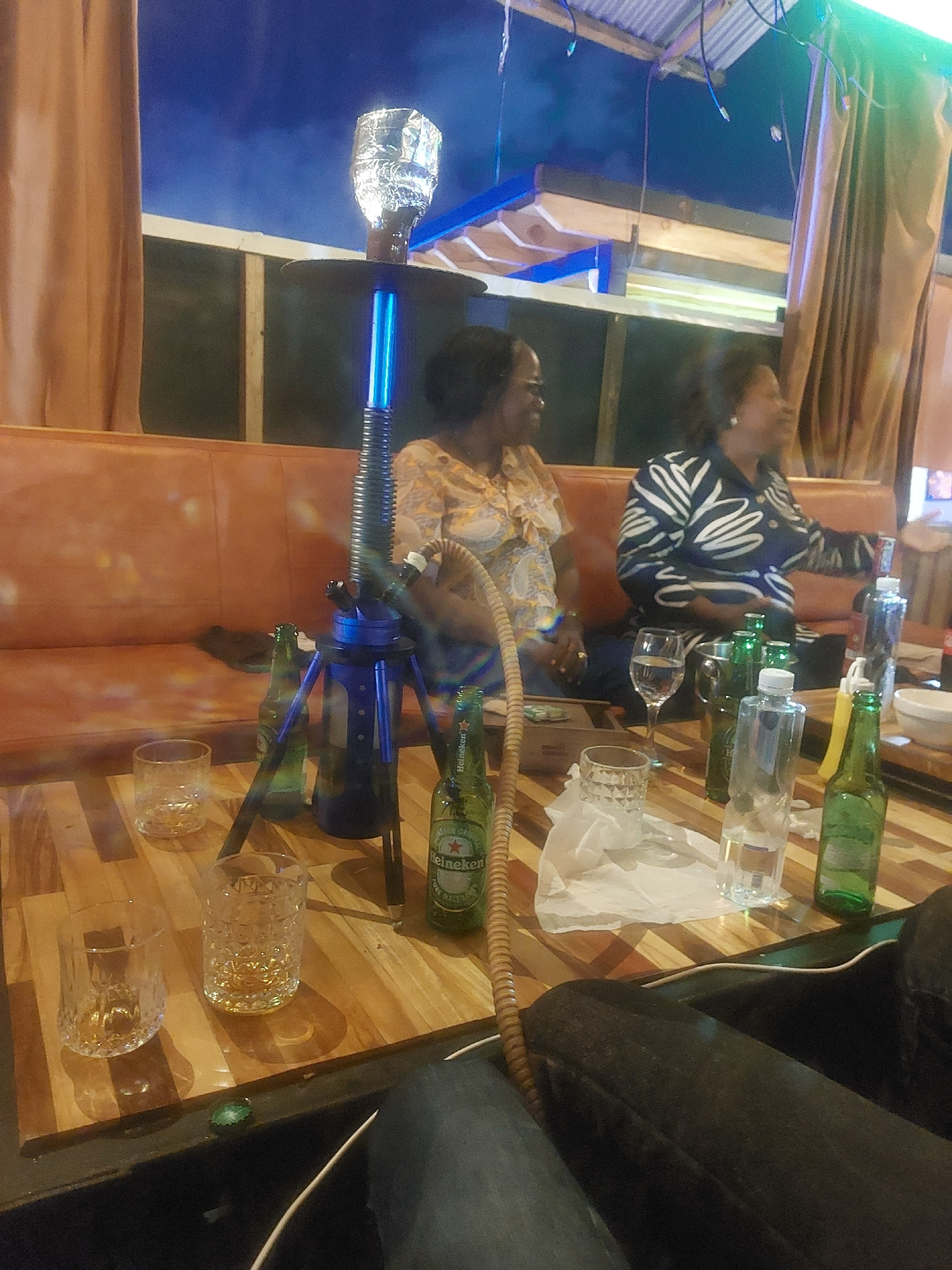 The image shows an indoor scene, likely a lounge or bar, in Dar es-Salaam, Tanzania. Two women are seated. One is wearing a patterned black and white shirt, and the other is wearing a floral top. They are positioned near a table that is crowded with objects including several Heineken beer bottles, various clear glasses (some appear empty, others may contain liquid), and a white napkin. A hookah, distinctively blue with a silver foil-wrapped bowl, is located closer to the foreground of the image. The seating appears to be cushioned. The lighting suggests evening or nighttime. The environment has a casual, social atmosphere. The background has elements of a building's structure visible. | Open Wire