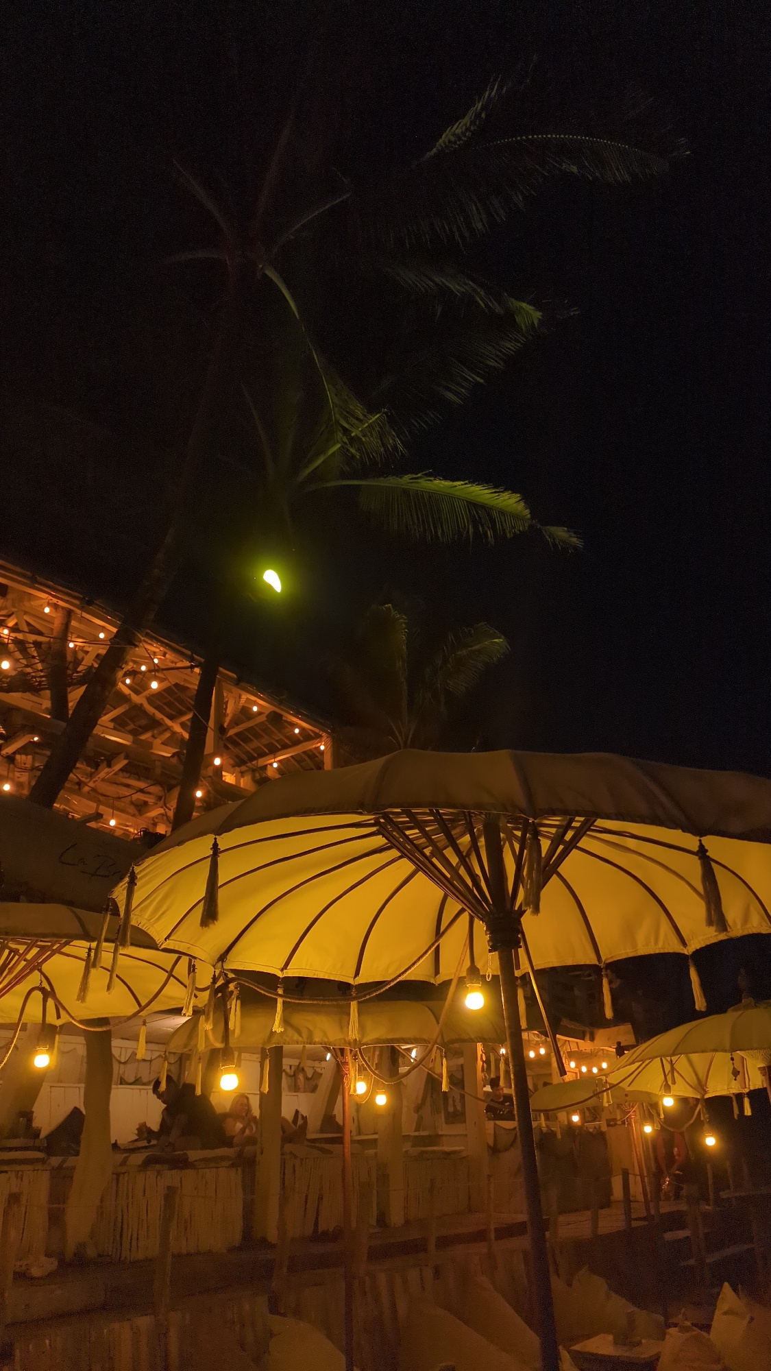 At night in North Kuta, Indonesia, a low-angle shot captures a scene illuminated by yellow light. In the foreground, a row of light-colored umbrellas are opened, each illuminated by string lights. Beh…read more