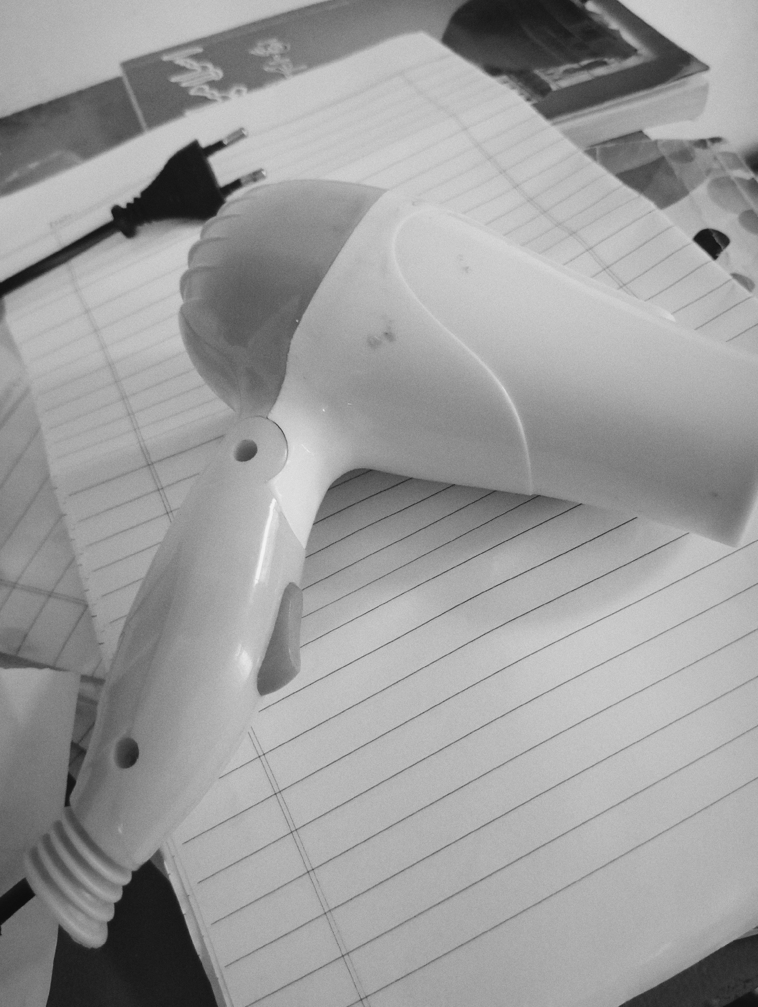 A black and white image shows a white hairdryer lying on top of lined paper. The hairdryer is angled from the lower left to the upper right of the image. A black power cord extends from the base of th…read more