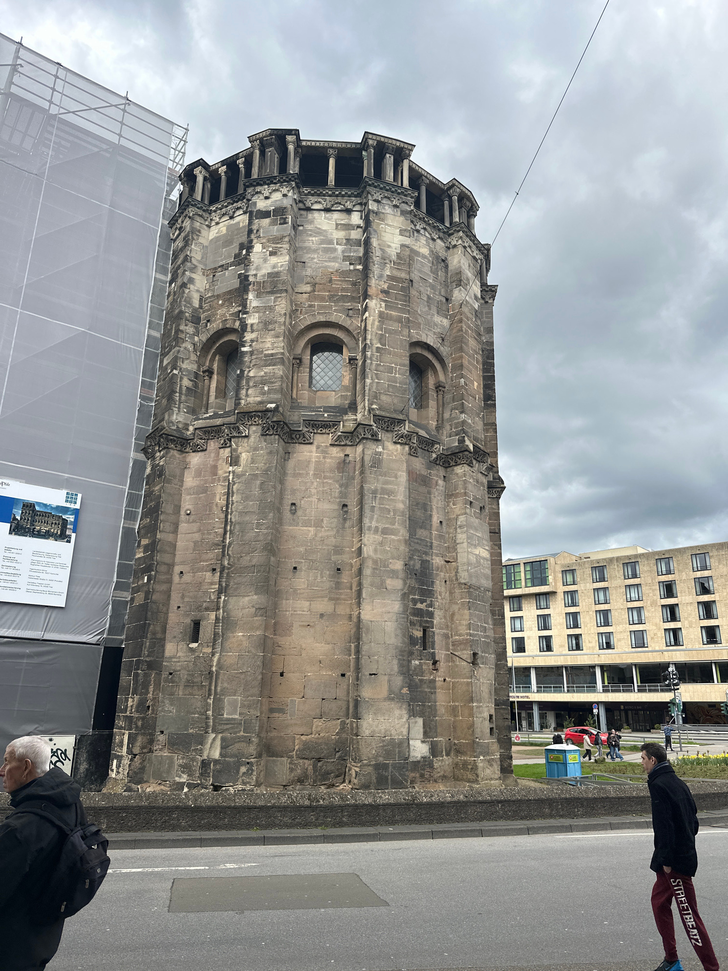 The image captures the Porta Nigra, an ancient Roman city gate in Trier, Germany. The Porta Nigra is a large, dark sandstone structure with multiple levels and arched windows. It is partially covered…read more