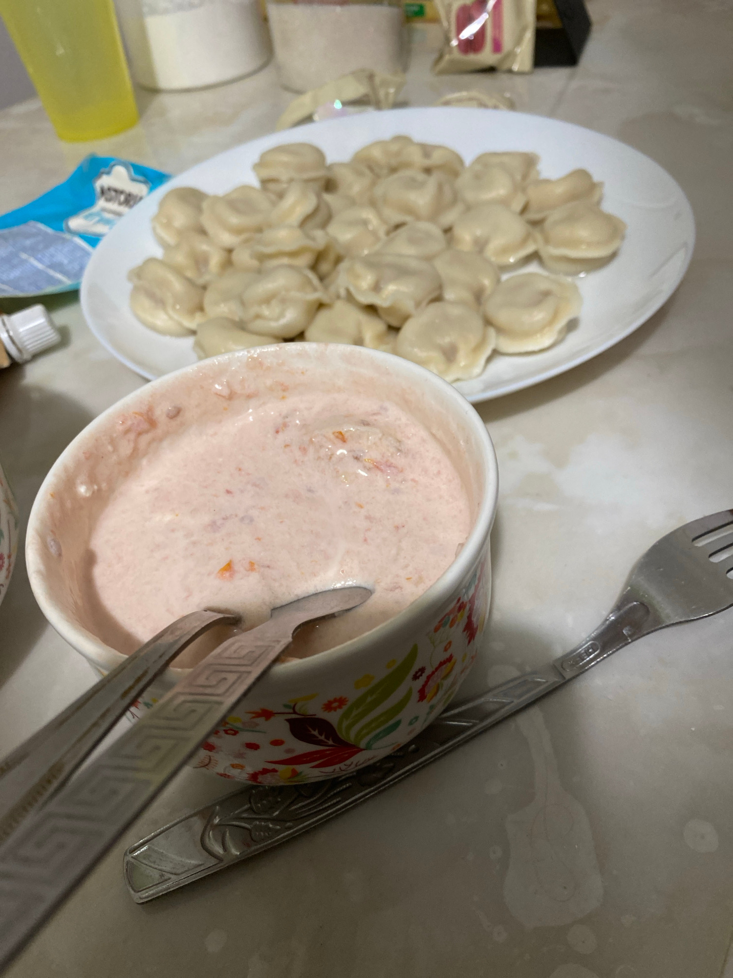 This indoor photograph, taken in Chaikovsky, Russia, showcases a meal consisting of dumplings and a creamy sauce. The main subjects are a white oval plate heaped with numerous light-colored, cooked du…read more
