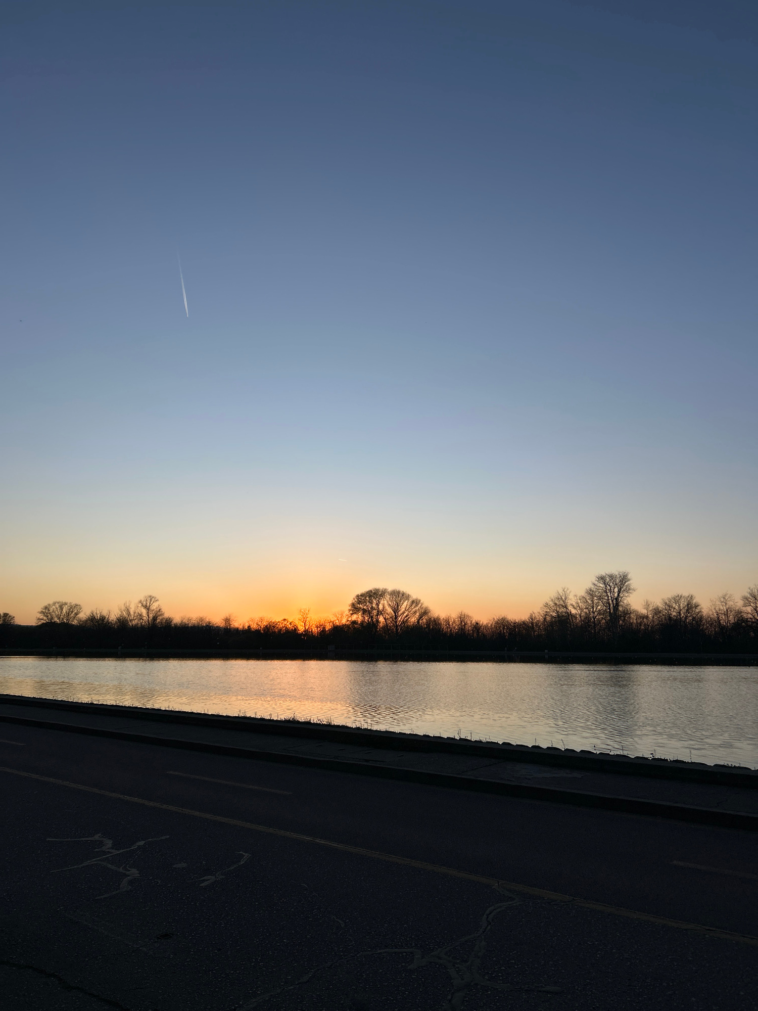 The image shows a sunset scene in Plovdiv, Bulgaria. The view appears to be from a road or path running alongside a body of water, likely the Maritsa River. Bare trees line the opposite bank of the ri…read more