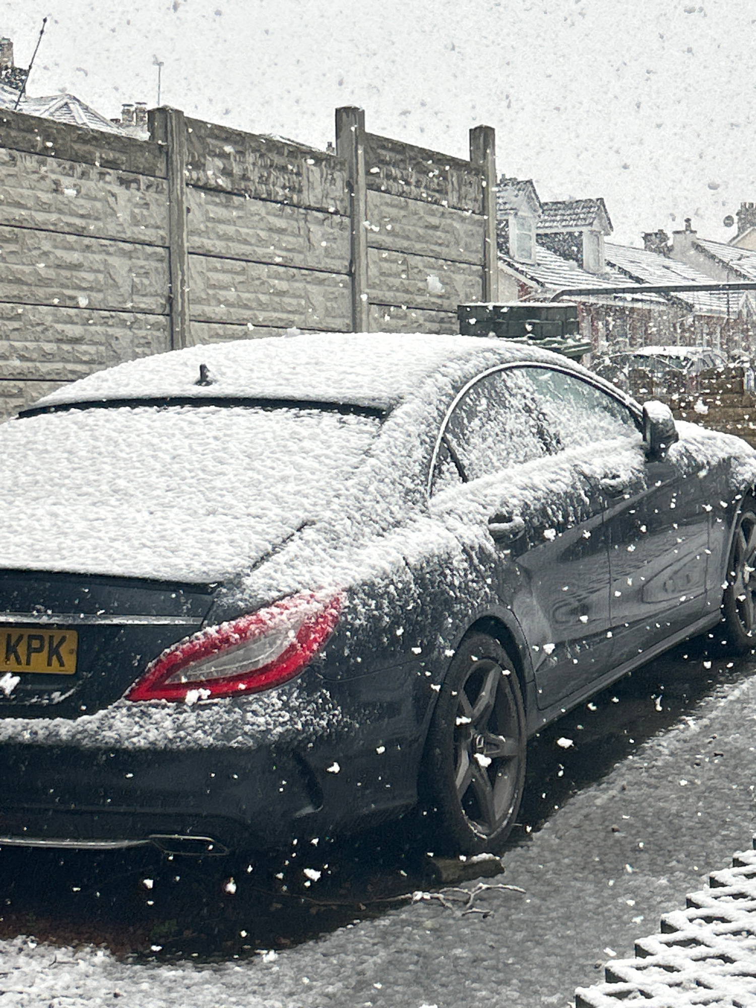 A black car is covered in snow. The car is parked on the side of the road next to a stone wall. Snow is falling heavily. The license plate of the car is visible, and reads "KPK". A residential buildin…read more