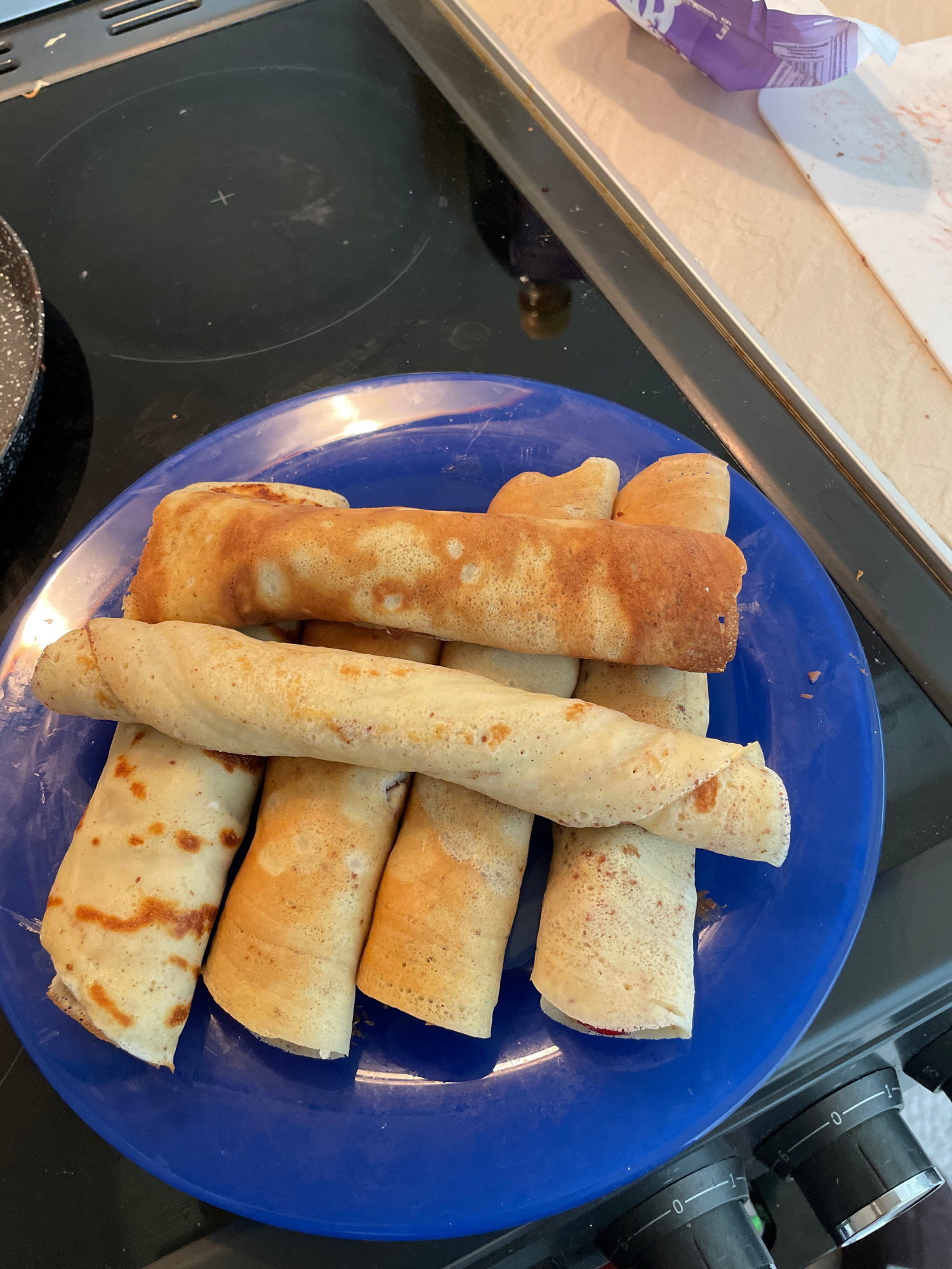 A bright blue plate filled with rolled pancakes rests on a black stovetop. The pancakes vary in color from golden brown to lighter beige with speckles, suggesting different cooking times or ingredient…read more
