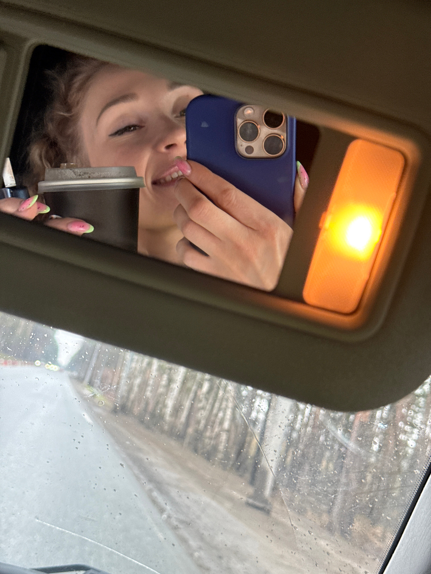 A woman is taking a selfie in the mirror of a car's sun visor. She's holding a blue smartphone, and the mirror is lit by an overhead lamp. Outside the windshield, the scene is wet, possibly raining, a…read more