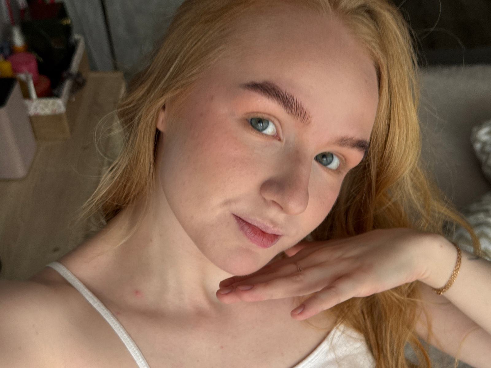 A close-up, tilted perspective depicts a fair-skinned woman with blonde hair and blue eyes. She wears a white tank top with thin straps. Her right hand is raised near her face, with a gold bracelet vi…read more