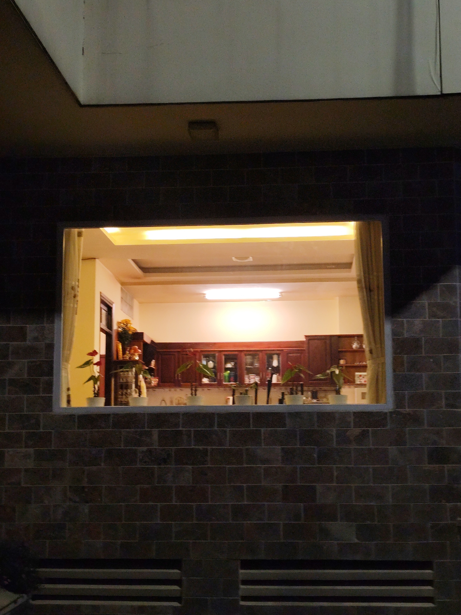 A window in a brick wall reveals an interior space, likely a kitchen, illuminated by ceiling lights. The kitchen features dark wood cabinetry and a counter populated with potted plants and objects. Th…read more