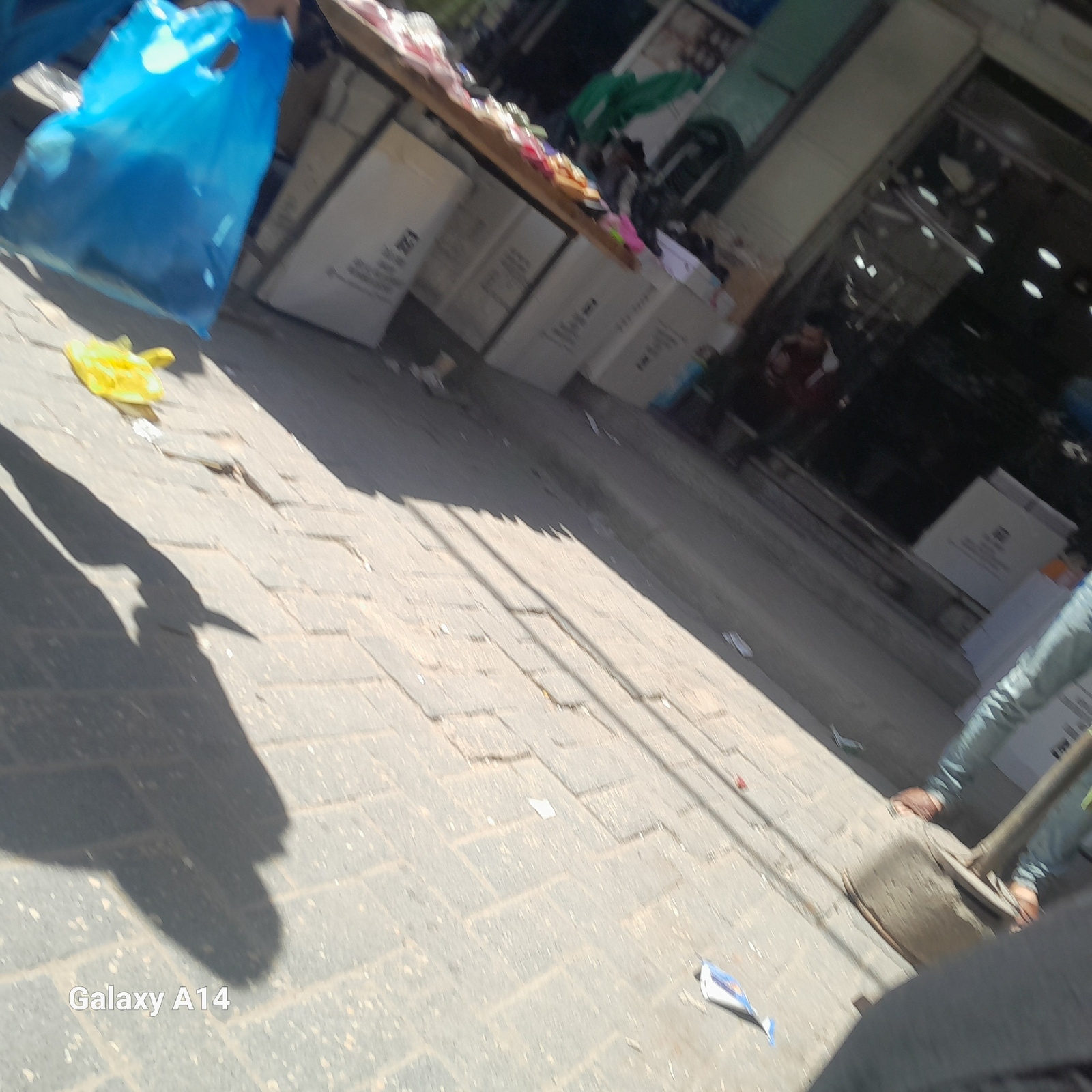The image depicts a street scene in Nuseirat, Palestinian Territory. A blue plastic bag is prominently displayed in the foreground, with a yellow object nearby. A row of white boxes is visible behind…read more