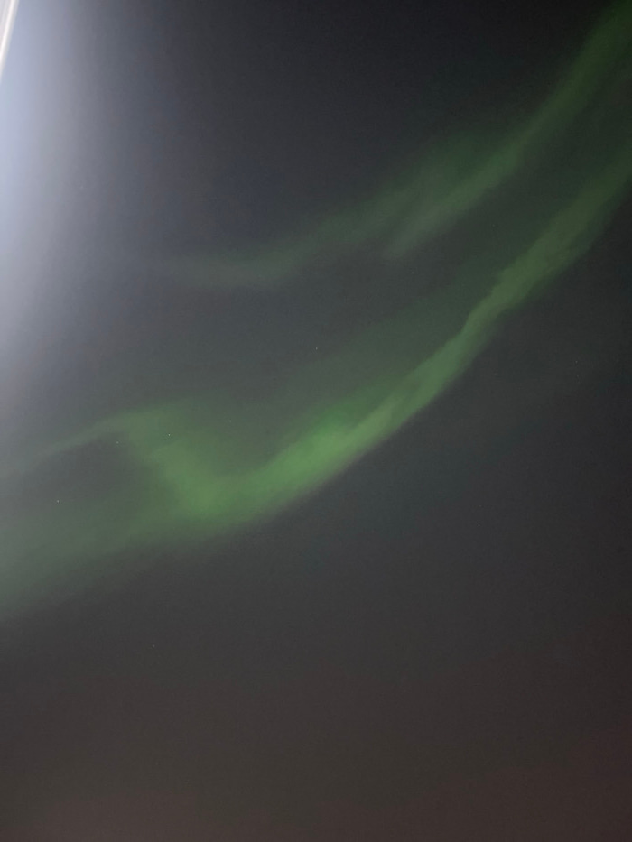 A night sky showcases the aurora borealis, with vibrant green ribbons stretching across the frame. The aurora's intensity varies, with some areas appearing brighter than others. A few faint stars are…read more