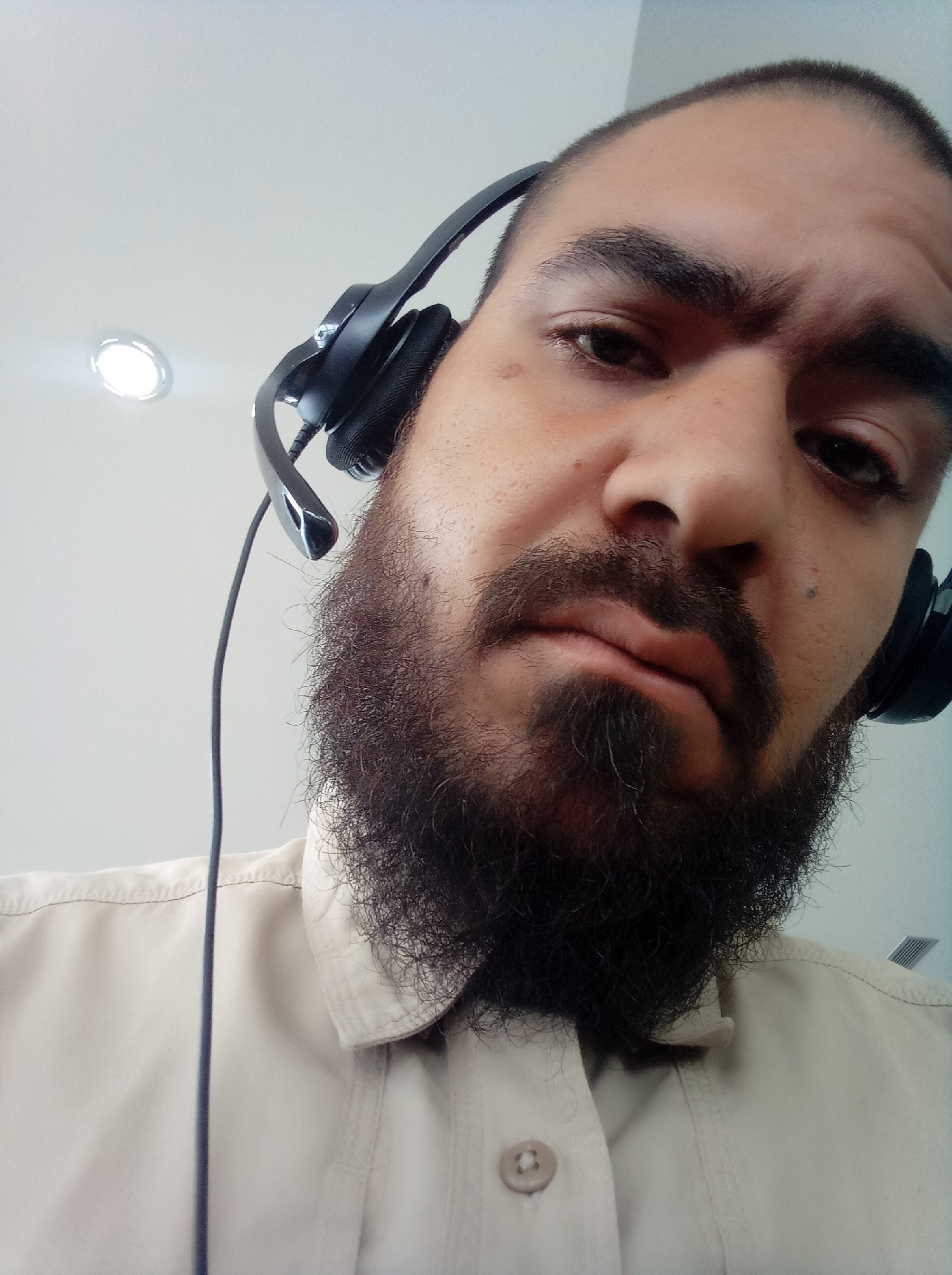 A close-up, low-angle shot depicts a man with a beard and mustache wearing a headset. He appears to be inside, beneath a ceiling fixture. There is no visual information in the photo that suggests a sp…read more