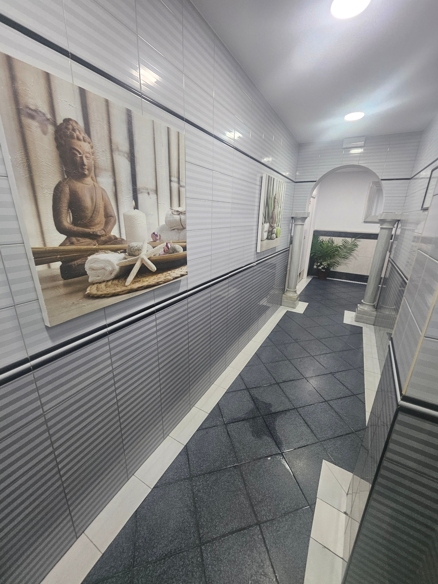 The image shows the interior of a building, possibly in Villa del Río, Spain. The scene features a hallway or corridor with light and dark gray striped walls and a dark gray tiled floor. There are two…read more