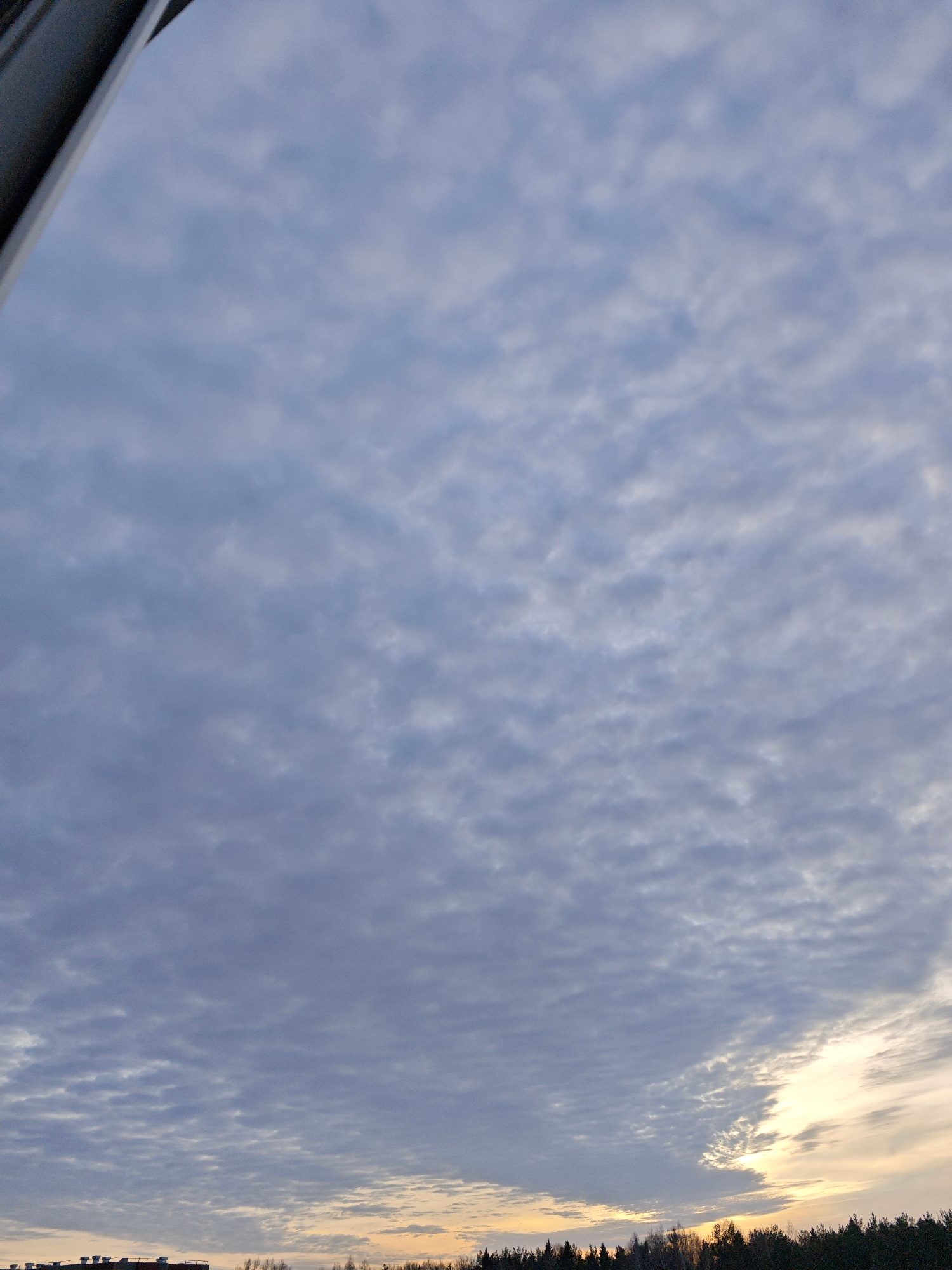 The scene depicts an expansive sky above a distant horizon in Markovskii, Russia. The majority of the frame is filled with a dense formation of greyish-blue altocumulus or stratocumulus clouds, exhibi…read more