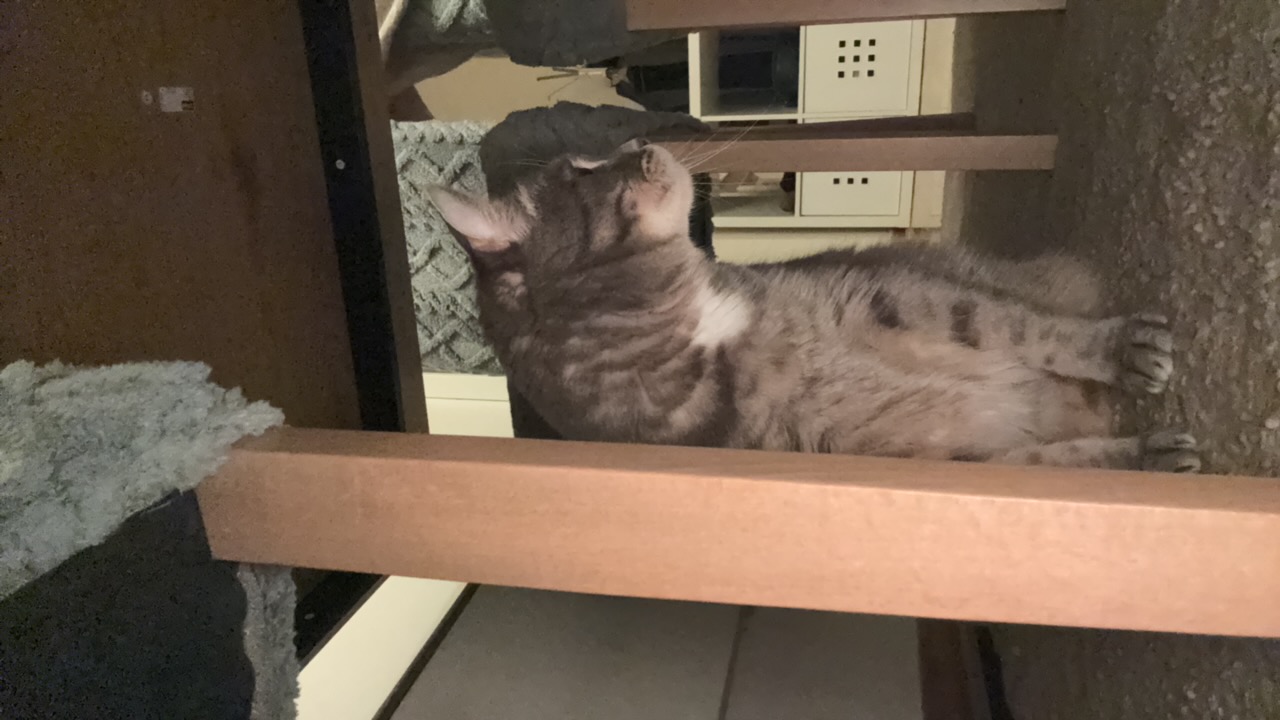 A close-up of a gray tabby cat resting its head on a patterned surface. The cat has green eyes, a pink nose, and white whiskers. The pattern on the surface consists of black squares and rectangles arr…read more