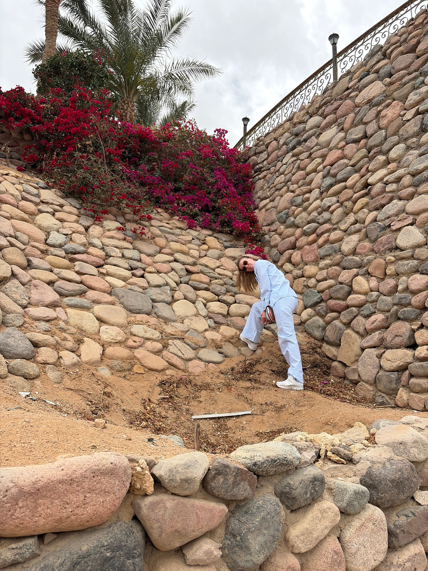 A woman in a light blue striped suit and white shoes poses between a rock wall and a large stone retaining wall. A palm tree and bougainvillea are to the left. The location is Sharm El Sheikh, Egypt.