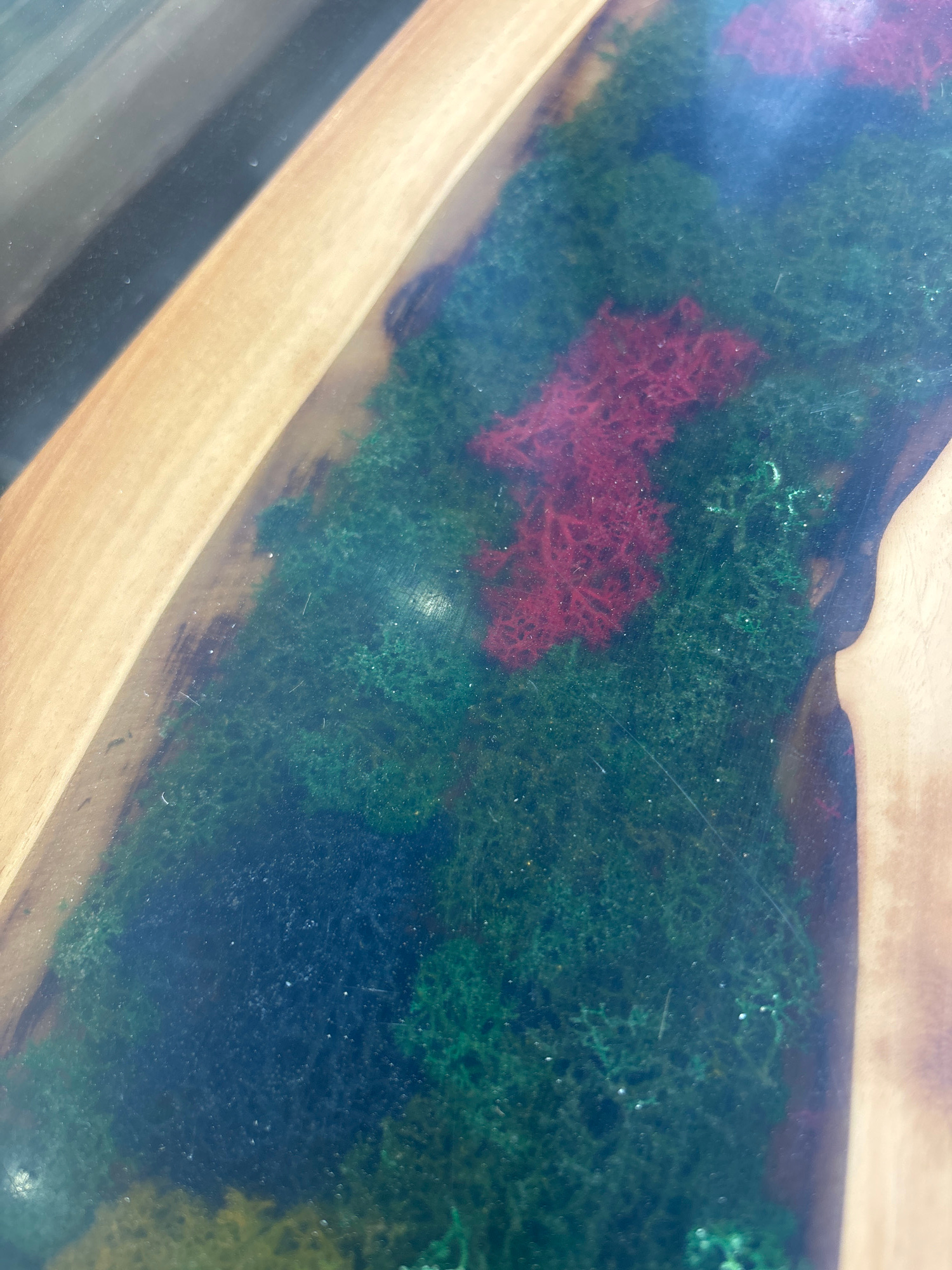 A close-up, angled shot of a table surface. The table consists of two wooden planks separated by a clear, resin-filled space. The resin contains green and red moss. The wood is light-colored. No peopl…read more