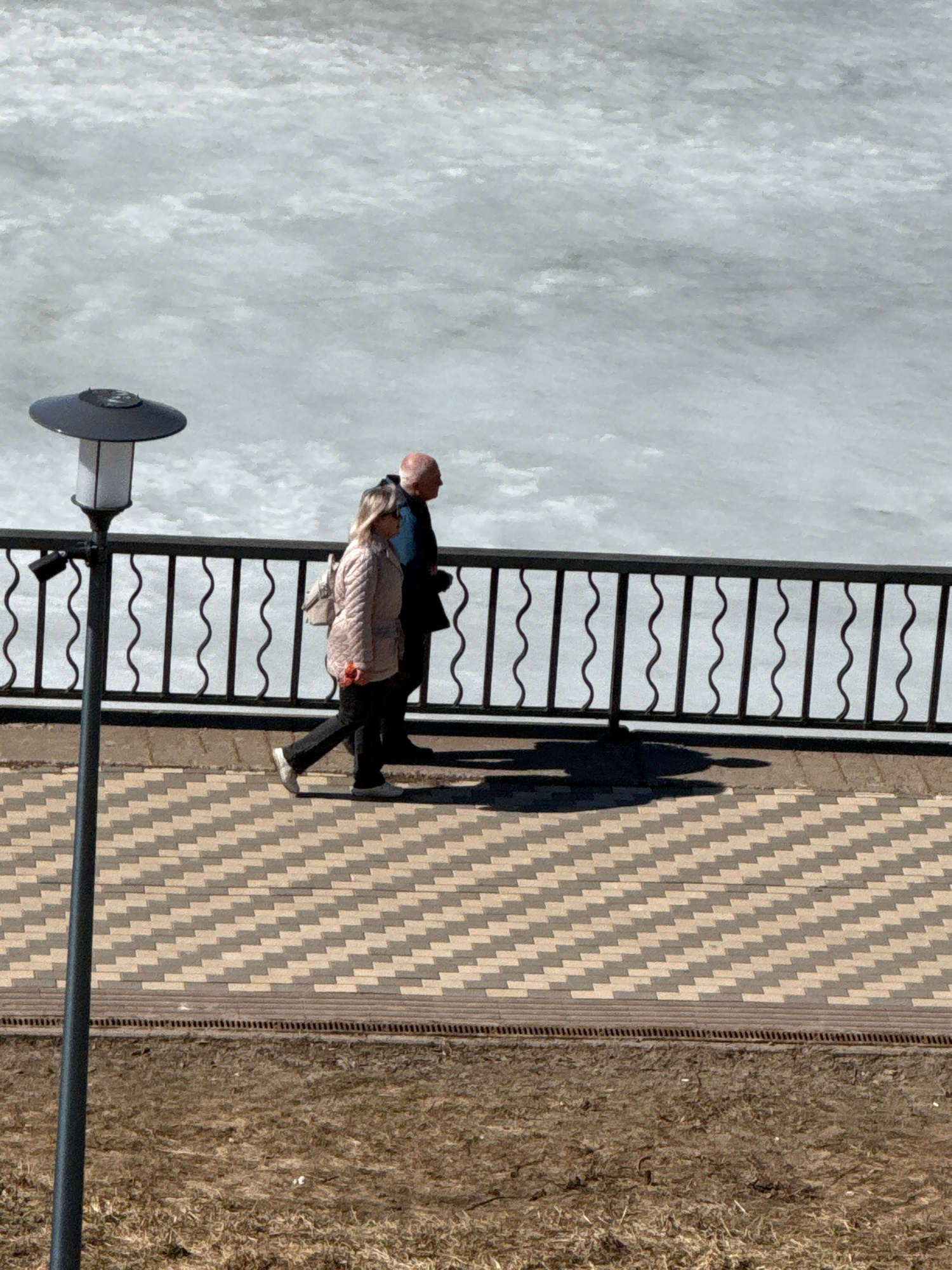 A couple is walking on a paved walkway next to a body of water in Votkinsk, Russia. A decorative metal railing separates the walkway from the water. The woman is wearing a light-colored coat and darkβ¦read more