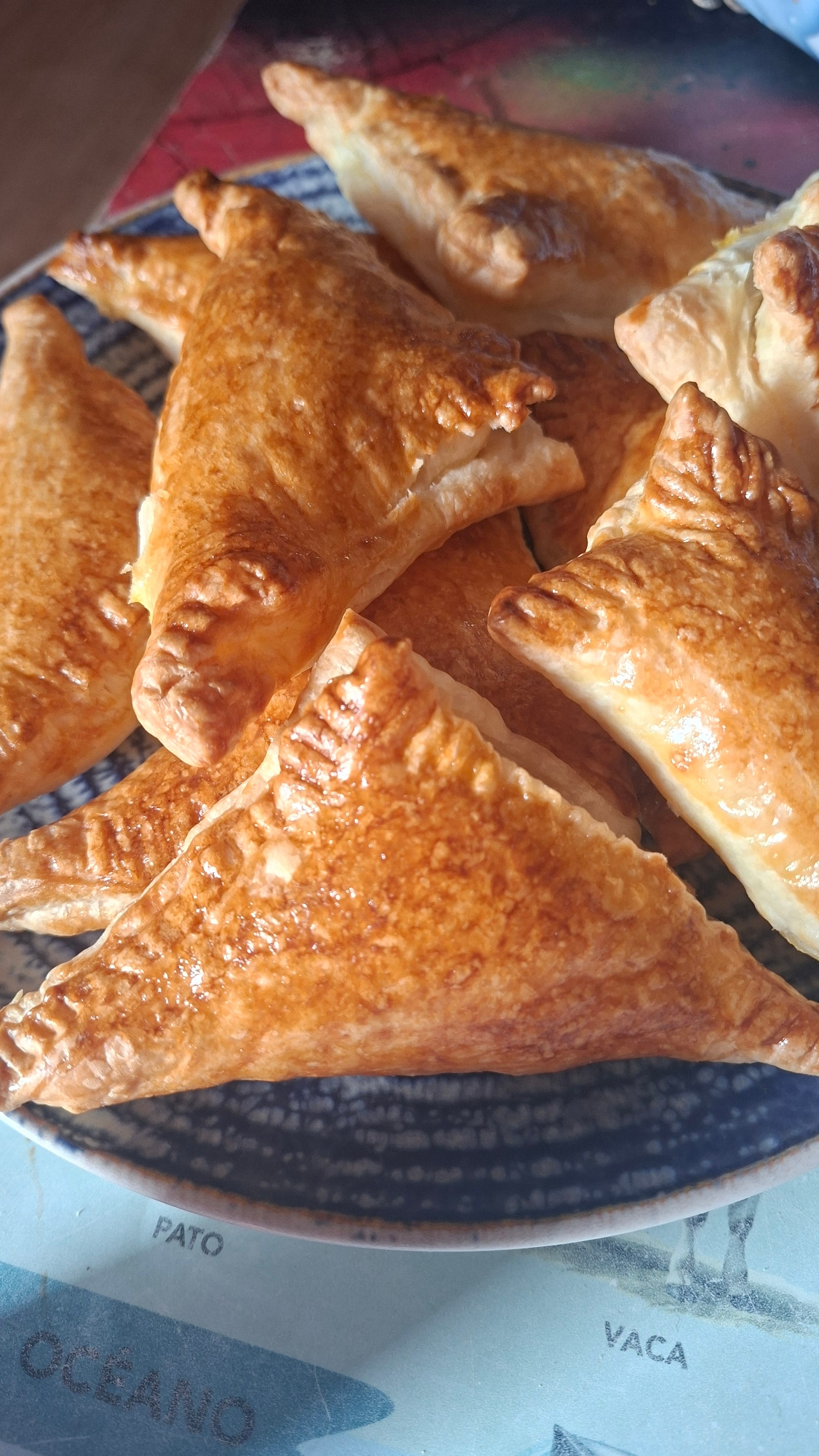 The image shows a close-up of a pile of golden-brown, triangular pastries on a plate. The pastries are arranged in a heap, overlapping each other. The plate has a blue and white patterned rim. The bac…read more