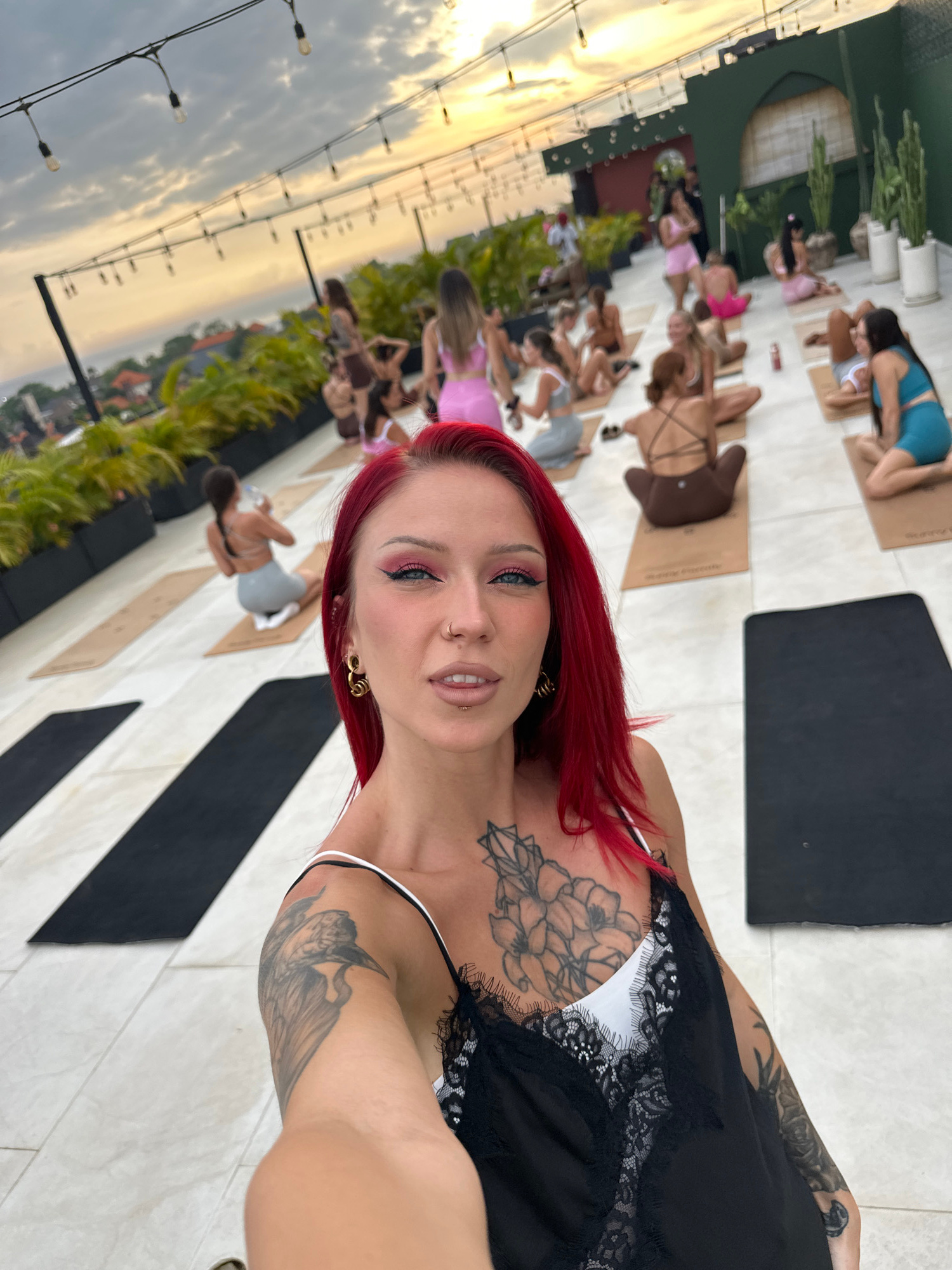 The image is a selfie taken outdoors, likely in Tibubeneng, Indonesia, based on the visible skyline and greenery. The woman in the foreground has red hair, visible tattoos on her chest and arm, and is…read more