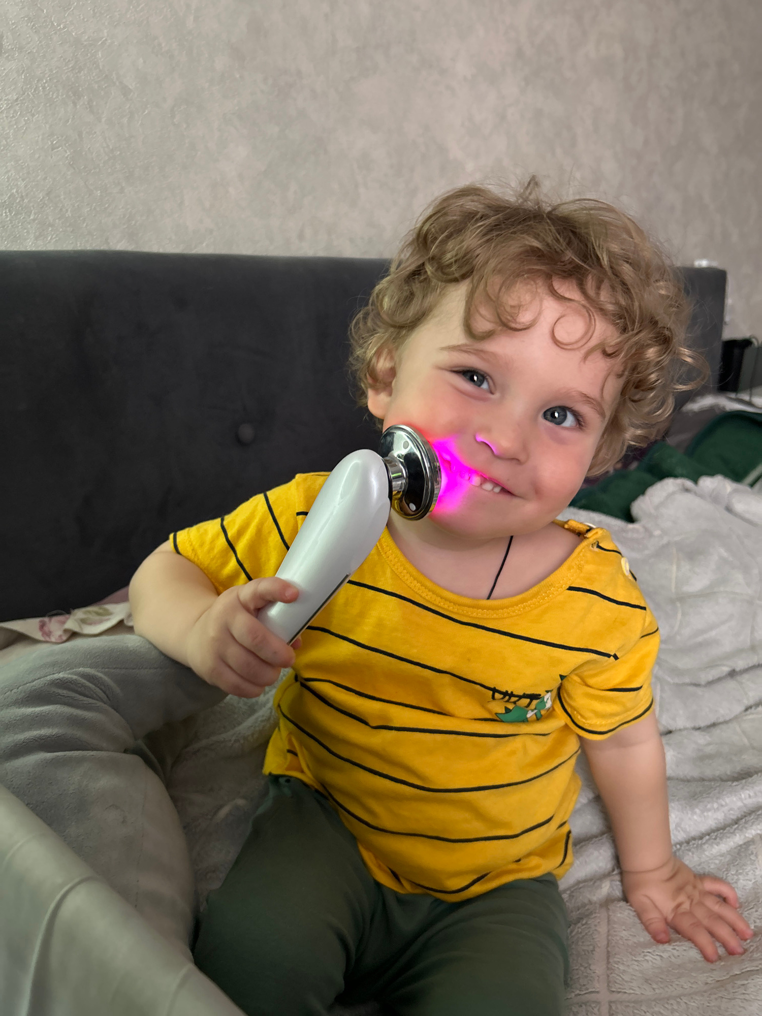 A toddler with curly blonde hair and blue eyes lies on a gray couch, wearing a yellow striped shirt and green pants. The child is holding a white and silver device with a pink light against their chee…read more