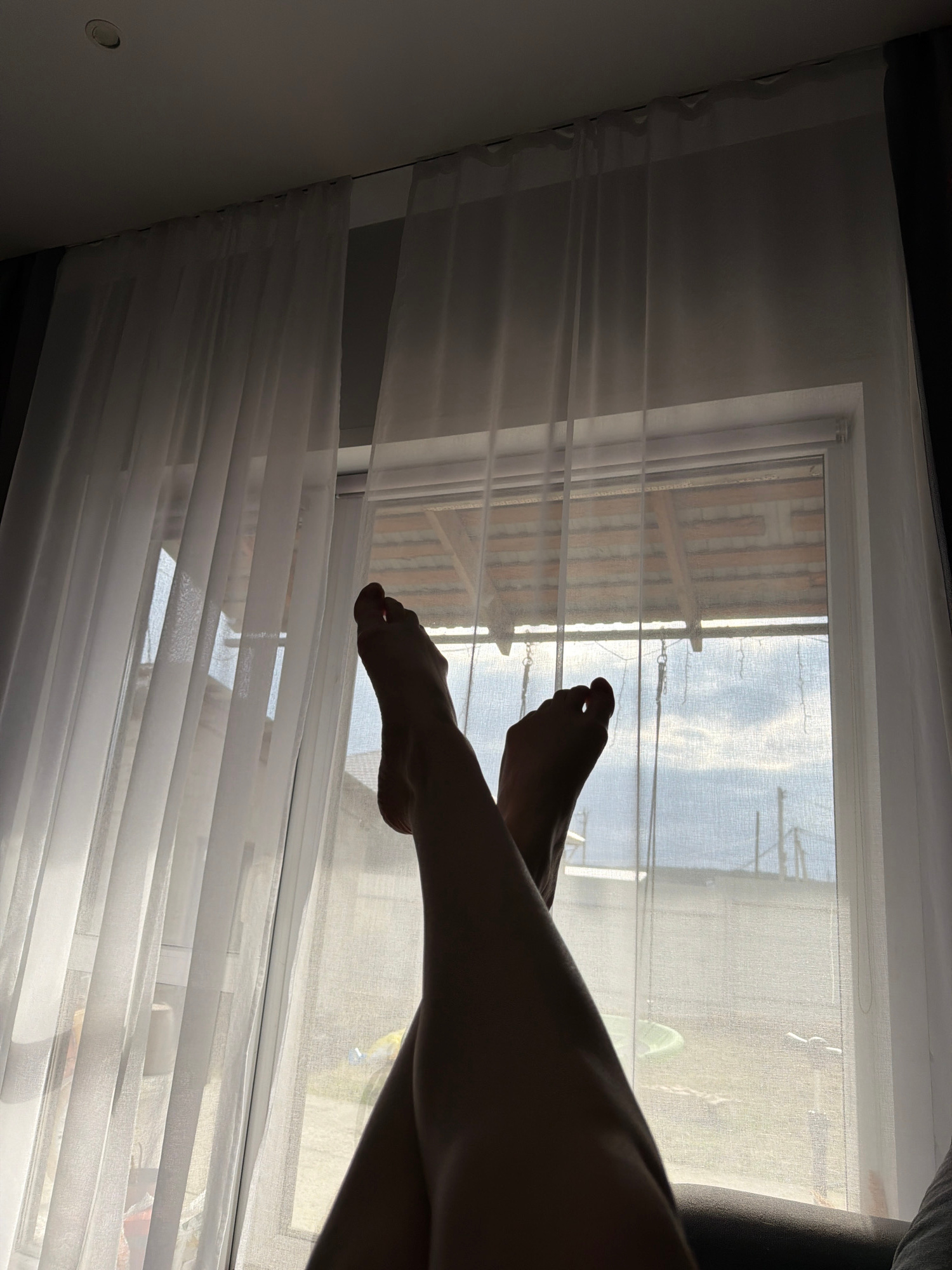 A photograph shows a pair of legs and feet silhouetted against a window covered with white, translucent curtains. Through the window, a view of a building exterior and a streetscape can be seen. The lā¦read more
