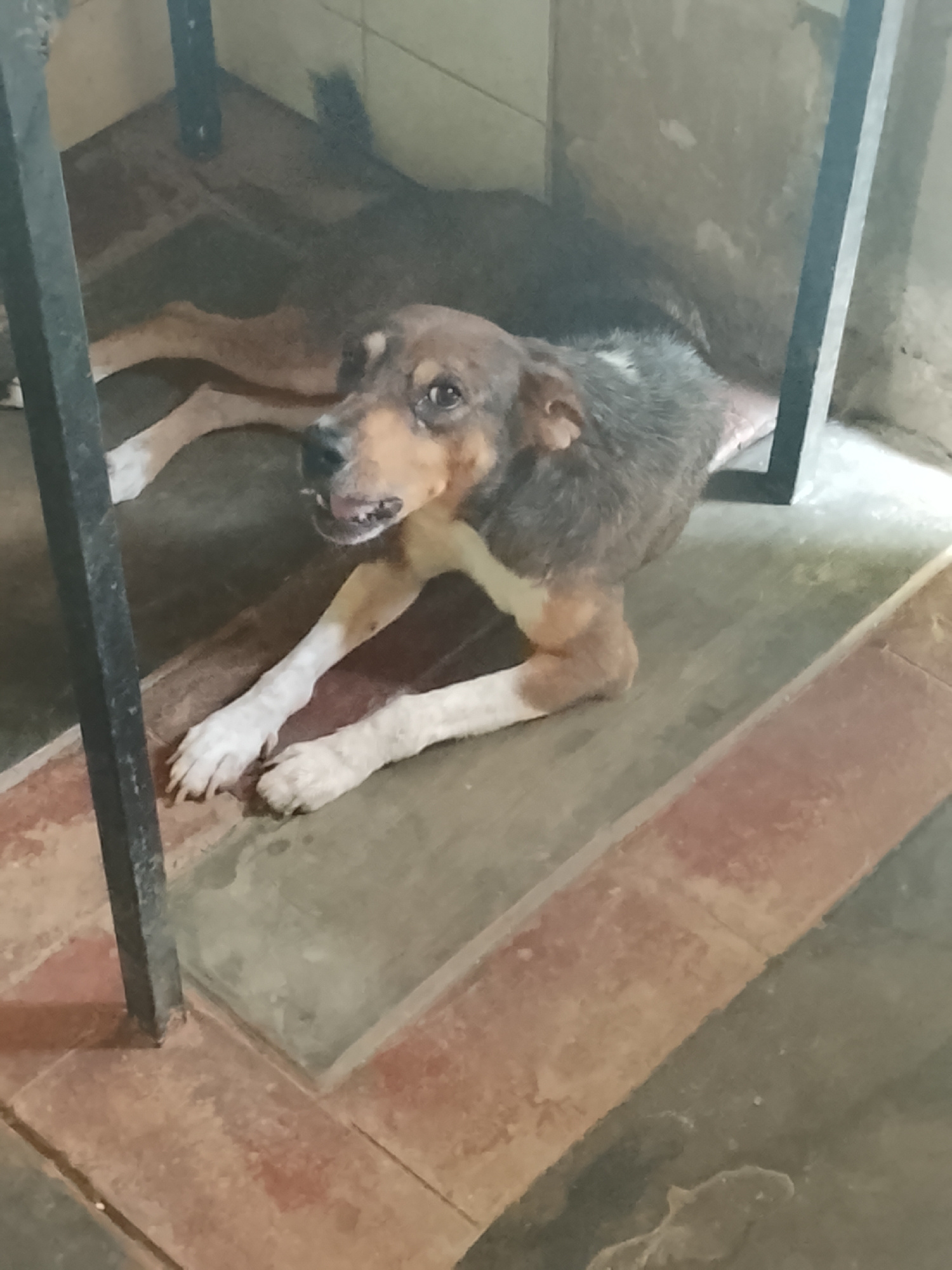 A medium-sized dog lies under what appears to be a table or desk, its body mostly obscured by the furniture. The dog has tan and brown fur on its head and legs, with a gray and white area on its back.…read more