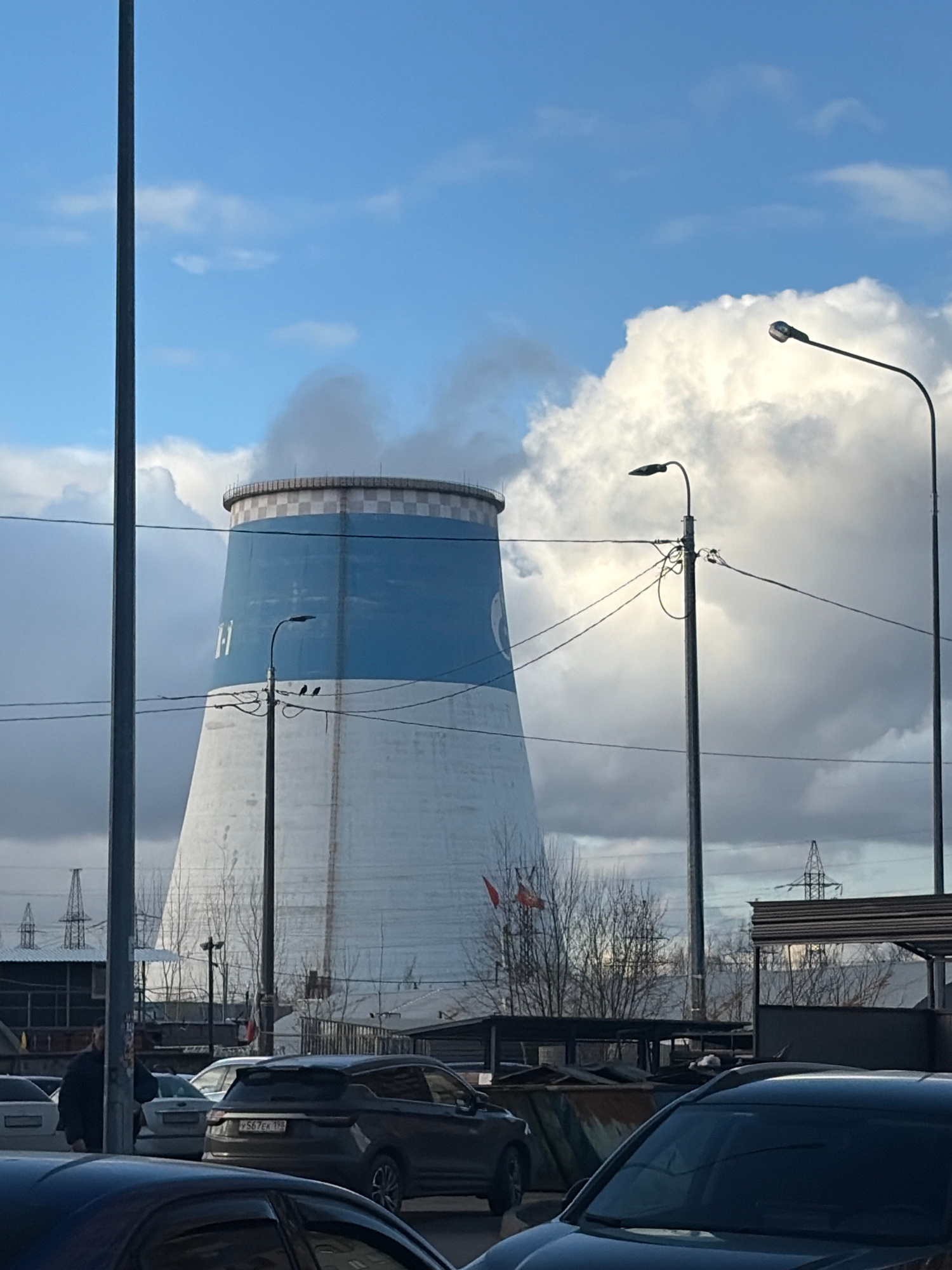 The image shows a large industrial cooling tower with a blue band at the top, emitting vapor, in the city of Saint Petersburg, Russia. The tower is situated behind a row of parked cars and streetlight…read more