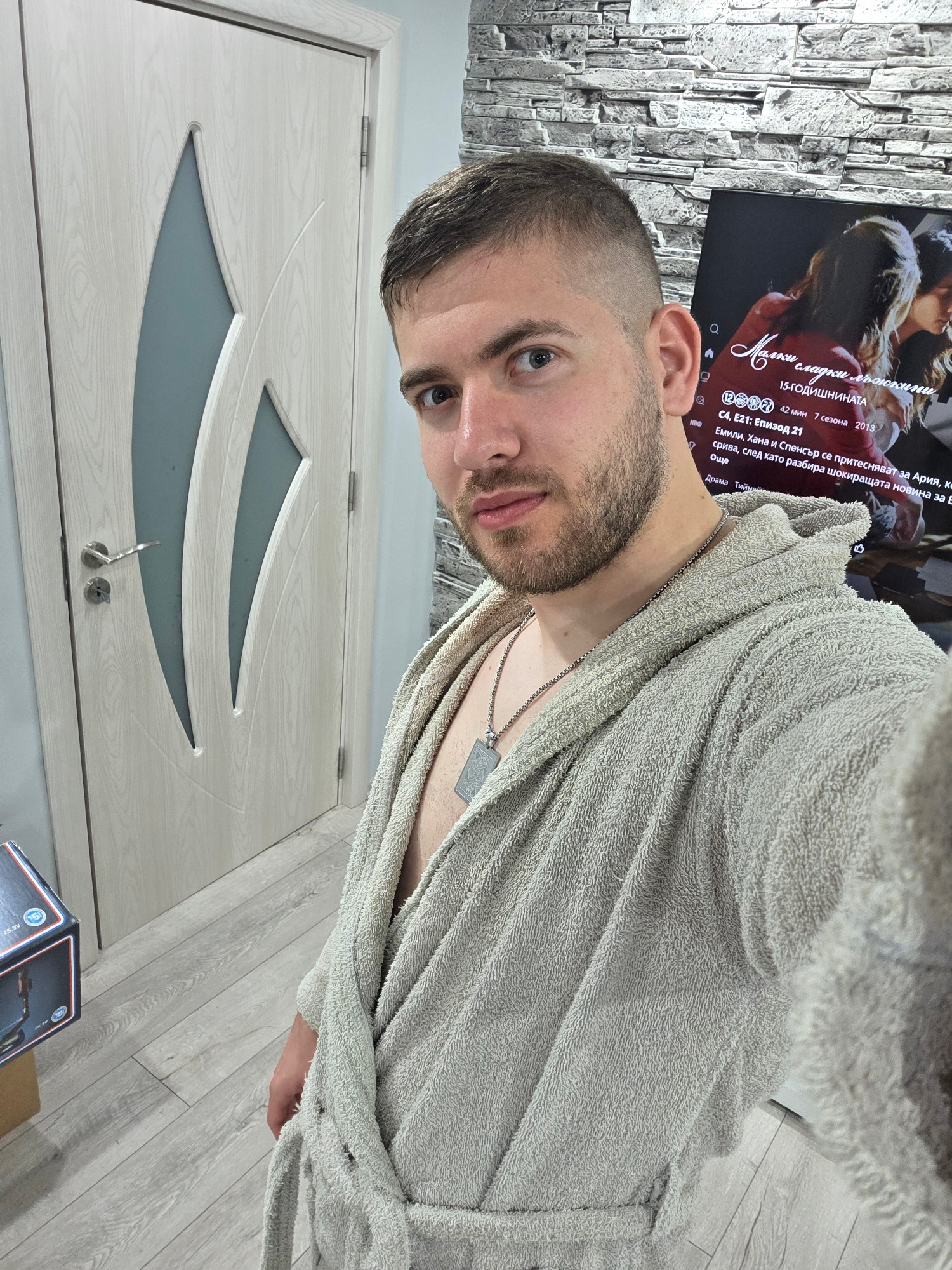 A man in a gray bathrobe stands indoors in front of a white door with decorative inserts. He has short hair and a beard. The man wears a silver necklace with a pendant. Behind him is a television show…read more